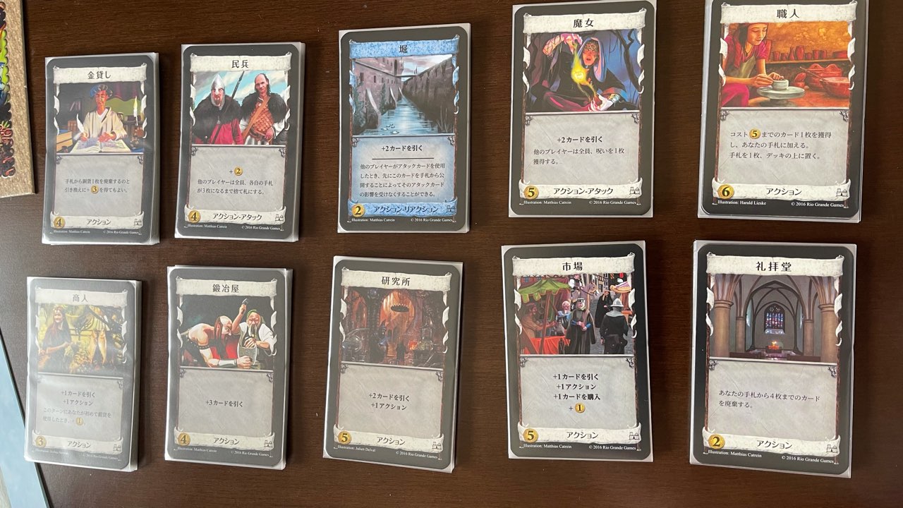 上のラインに財宝カード・勝利点カード・呪いカードを並べておき、その下に10種類の王国カードを並べていきました。イーオンズエンドの元になったゲームシステムということだけあって、王国カードのサプライがイーオンズエンドのサプライと似た印象です。