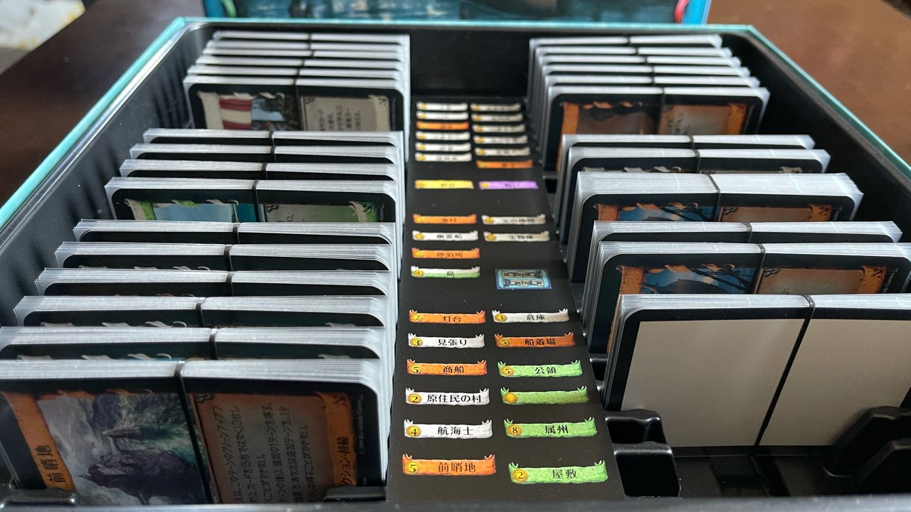 一通り開封・スリーブ装着・カード束まとめを終えた段階がこちら。空いている箇所はドミニオン基本セットを購入した場合に、「海辺」単体で遊べるようにするためのスペースです。