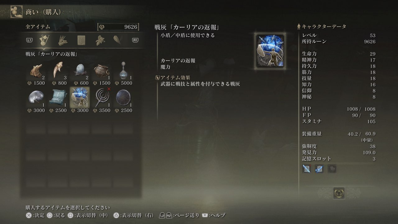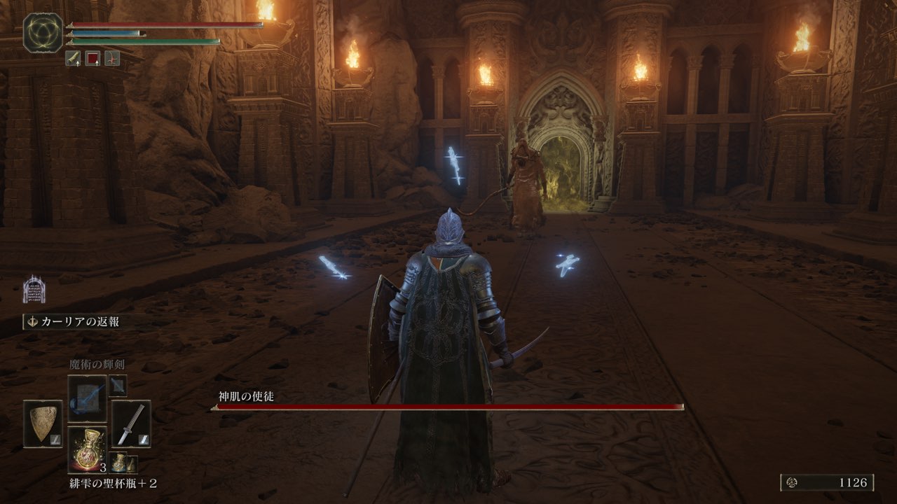 ここで戦灰「カーリアの返報」を購入することができるようになりますので、「神肌の使徒」が倒せない場合は先にこちらを攻略するといいかもしれません。