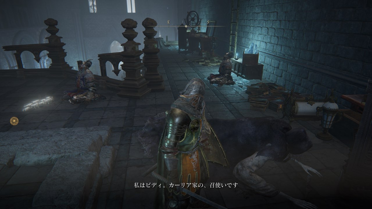 このボスを倒した後に進めるようになる「スリーシスターズ」エリアから再び「カーリア城館」の屋根に降りるように進んでいくと「召使いペティ」が居ます。