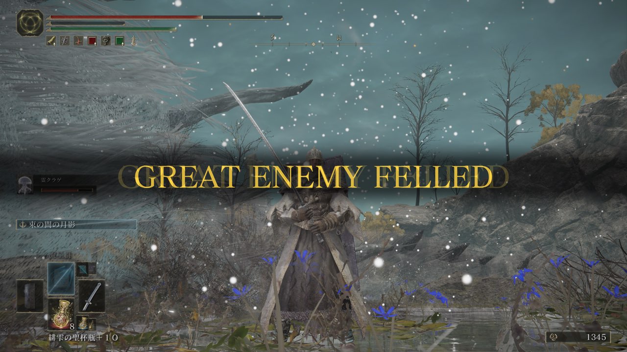 思ったよりも弱体化されていたのか、それとも褪せ人のレベルを上げすぎたのか、想像以上にあっさりと終わってしまって、なんだか物足りない気持ちでいっぱいになってしまいました。