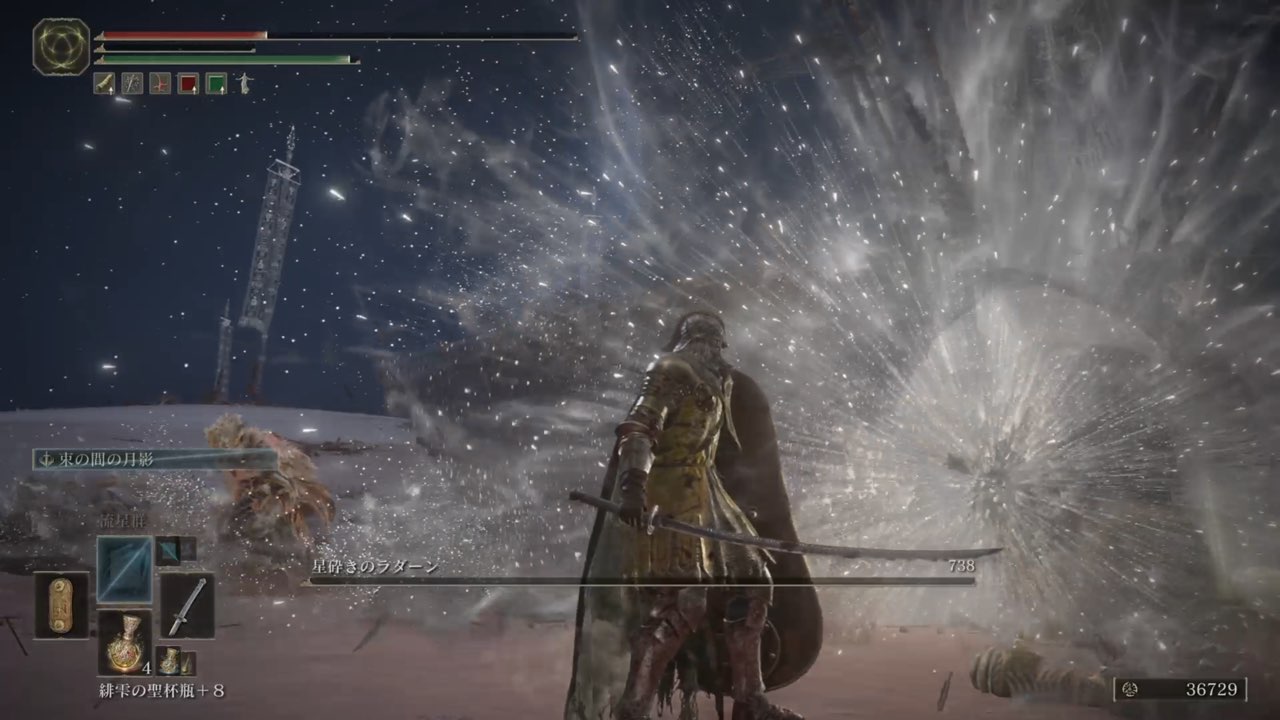 この瞬間、「先日のエルデンリングアップデートVer.1.03(現在は1.03.02)より、ラダーンが弱体化されたのでは?」という話題をチラッと見かけた記憶が脳裏を過ぎる。