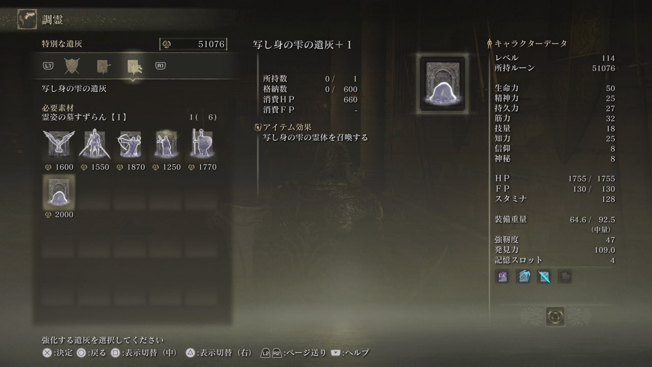そしてこのエリアでようやく、最強の遺灰と名高い「写みの雫の遺灰」を入手可能になります。