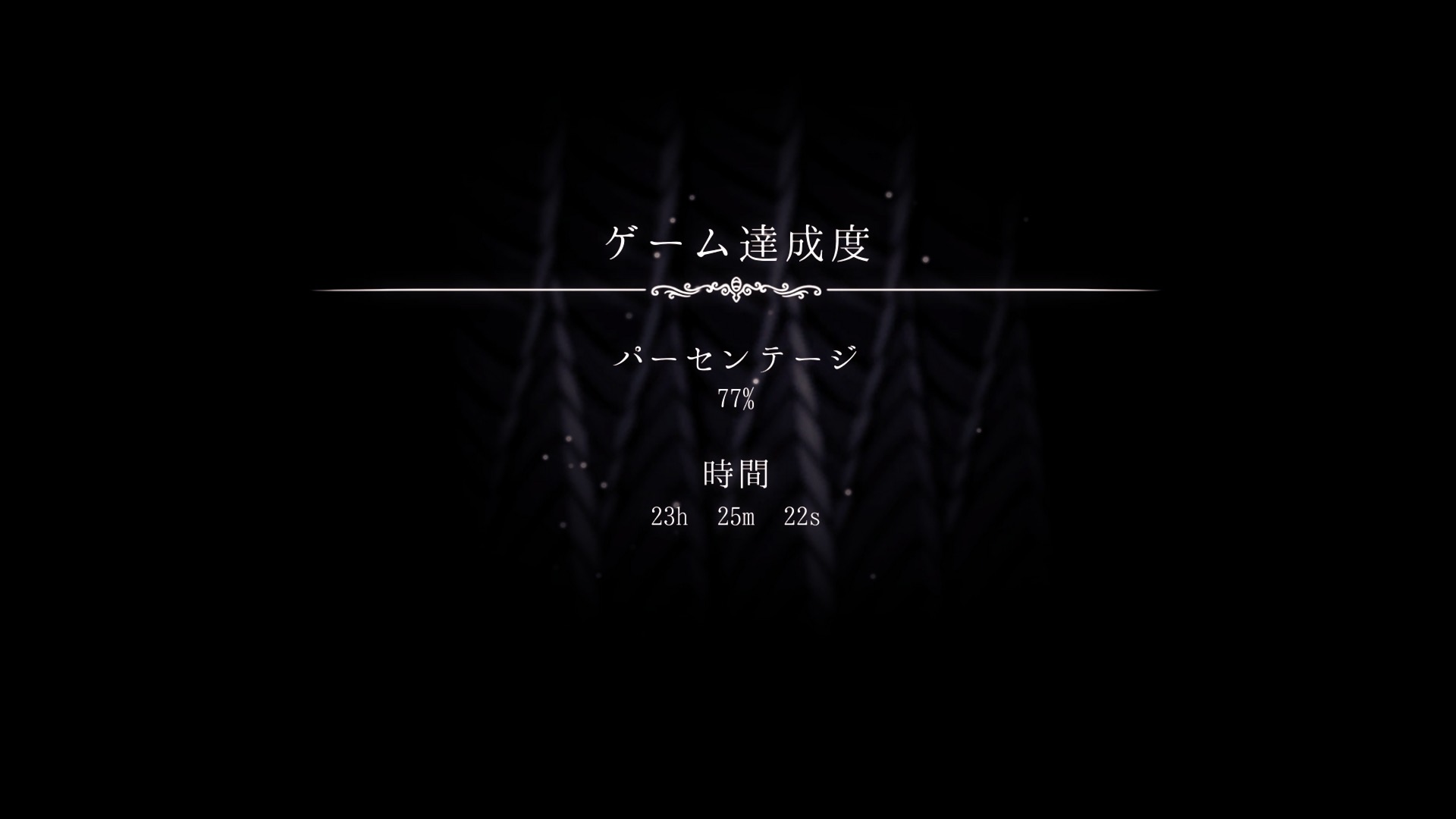 メインクエストを中心に進めた最終的なプレイ結果として、クリア時間が23時間、ゲーム達成度は77%。