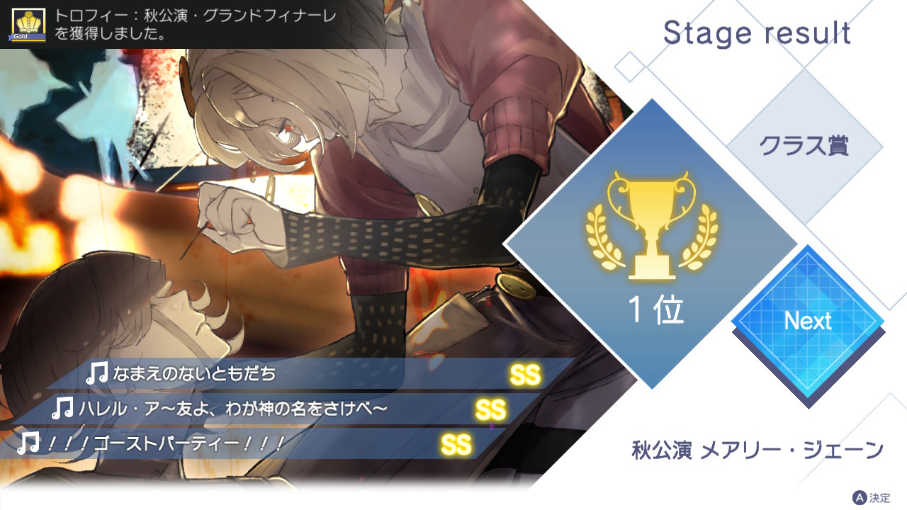 これにて、秋公演「メアリー・ジェーン」が終演となりました。歌唱パート・ダンスパートいずれもSSランクのおかげでクラス優勝もぎ取り。
