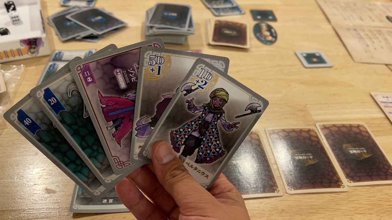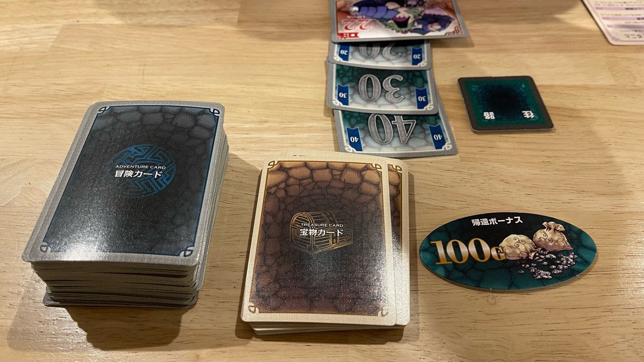 基本的には手札を5枚キープしながら、ダンジョン内を進んでいき、ダンジョンカードが100以上に達した時点で宝物カードを引いて地上まで引き返すというシンプルなゲームです。