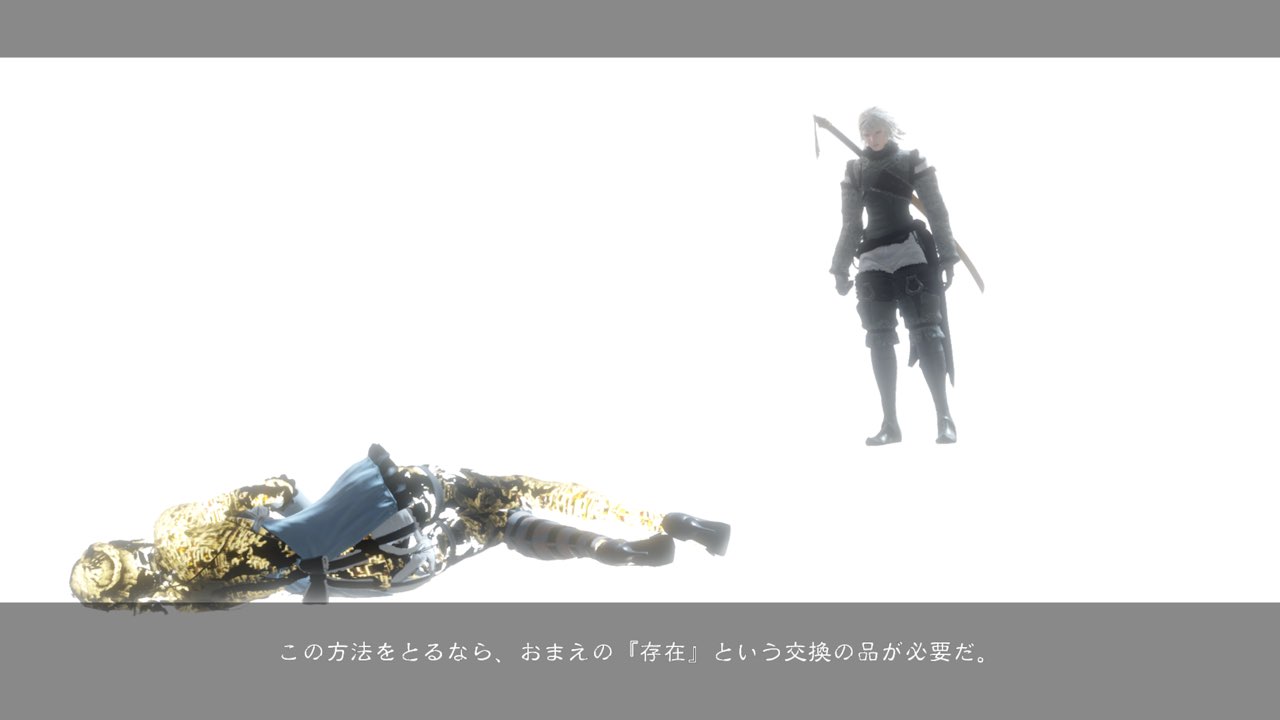 ニーアは救い出した妹ヨナと過ごせる日々を捨て、共に戦ってくれた大切な仲間であるカイネの命を救うことを決断。