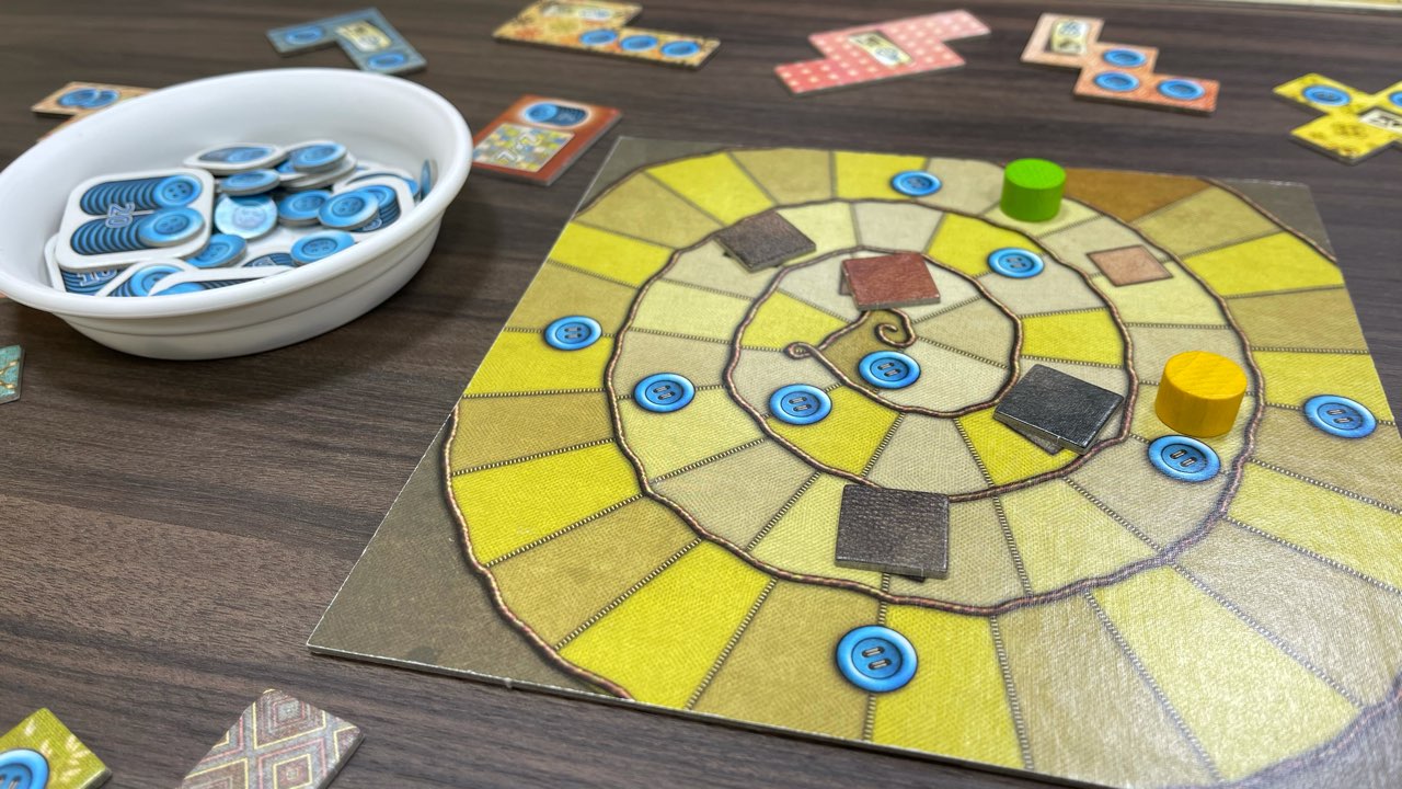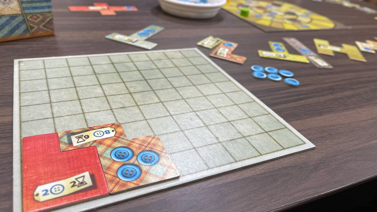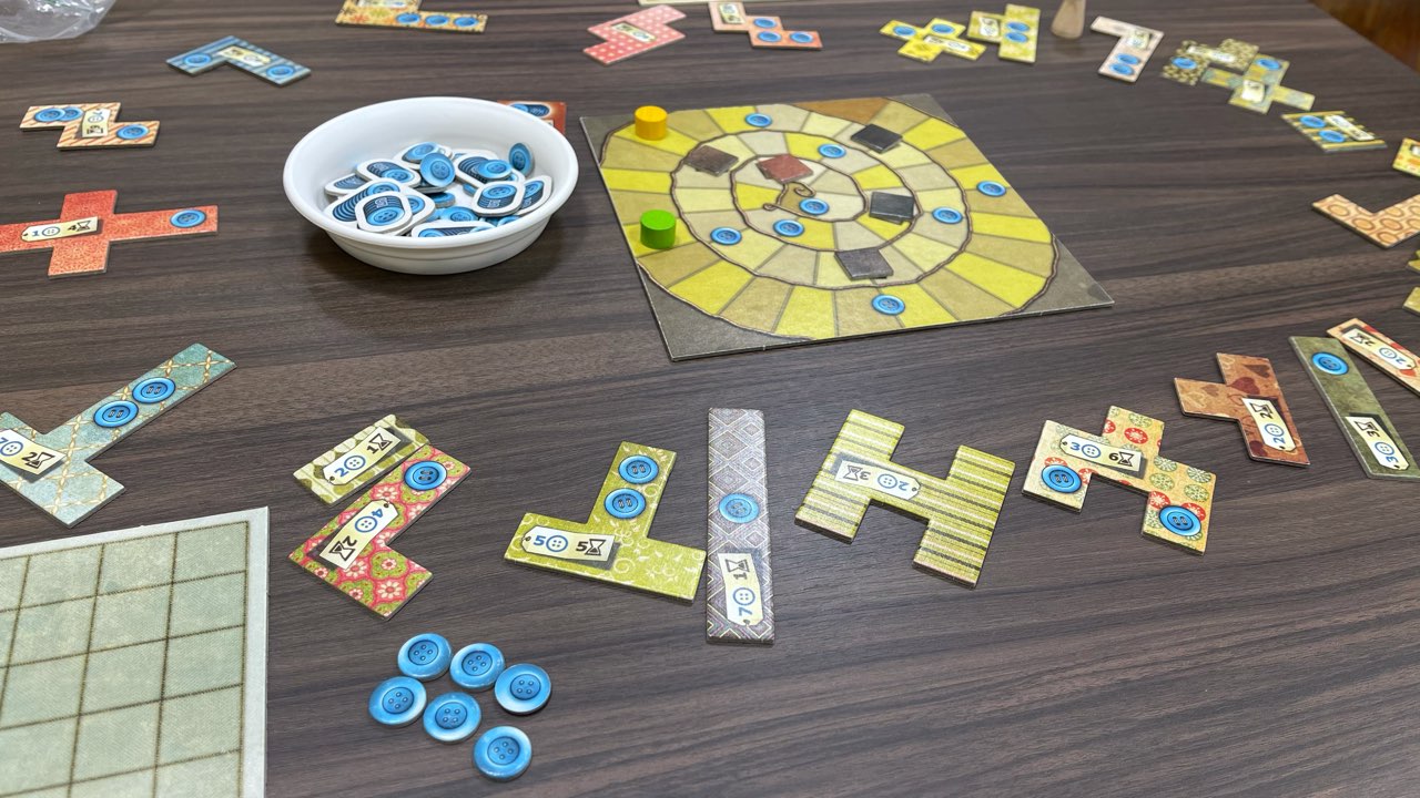 中心のゲームボードを取り囲むように配置した色とりどりで多様な形のパッチタイルを取り合い、自分のキルトボードに一番隙間なく配置しつつ、手持ちのお金(青いボタン)を多く残していた方が勝ち。