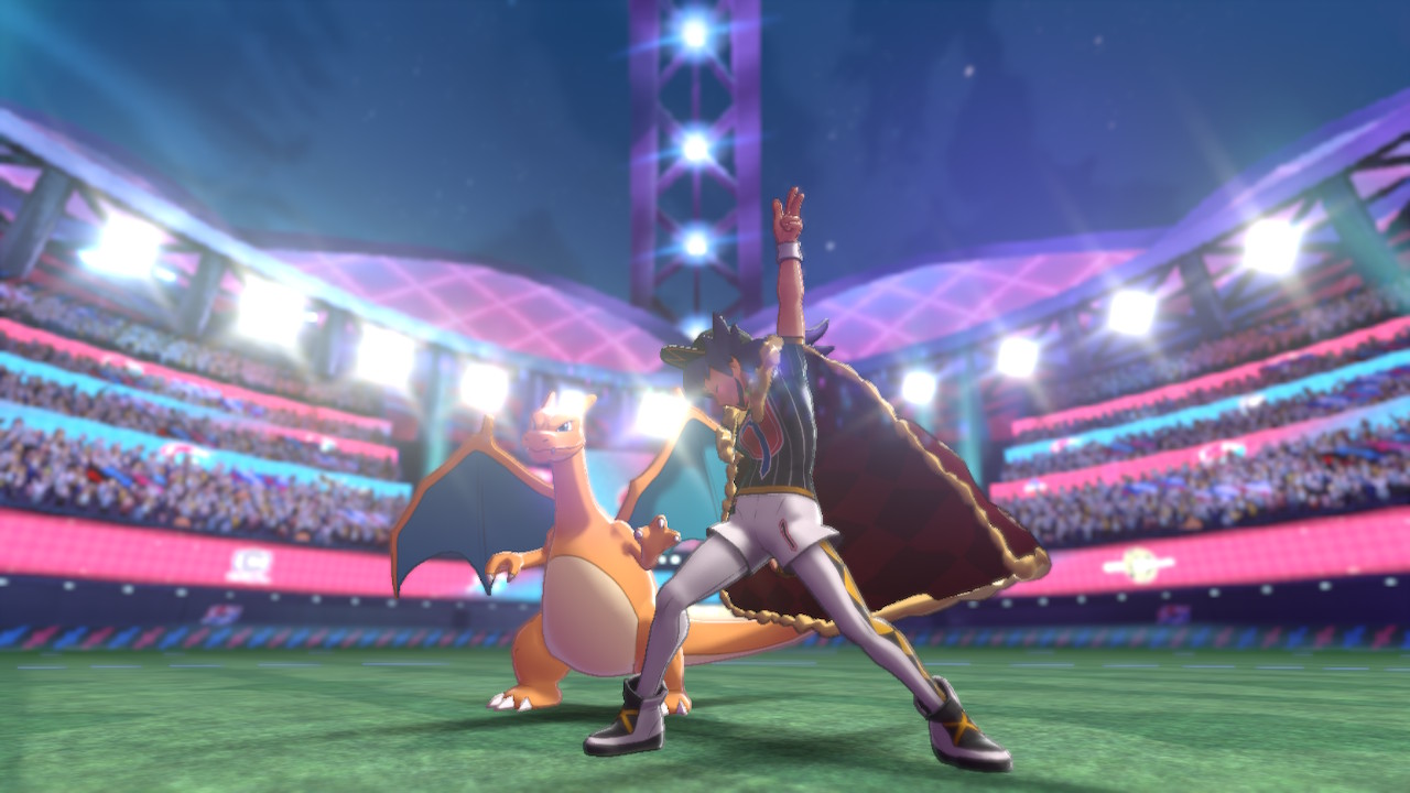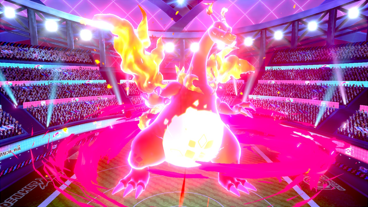 チャンピオンダンデのリザードンがダイマックスで巨大化し、エキシビジョンマッチで大勢の観客の中ポケモンバトルを繰り広げていく。