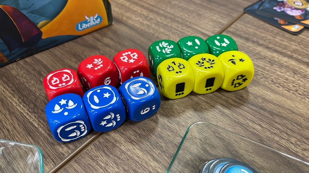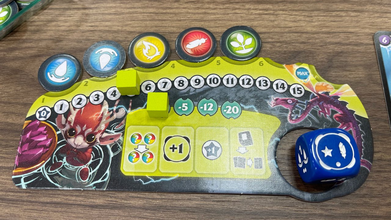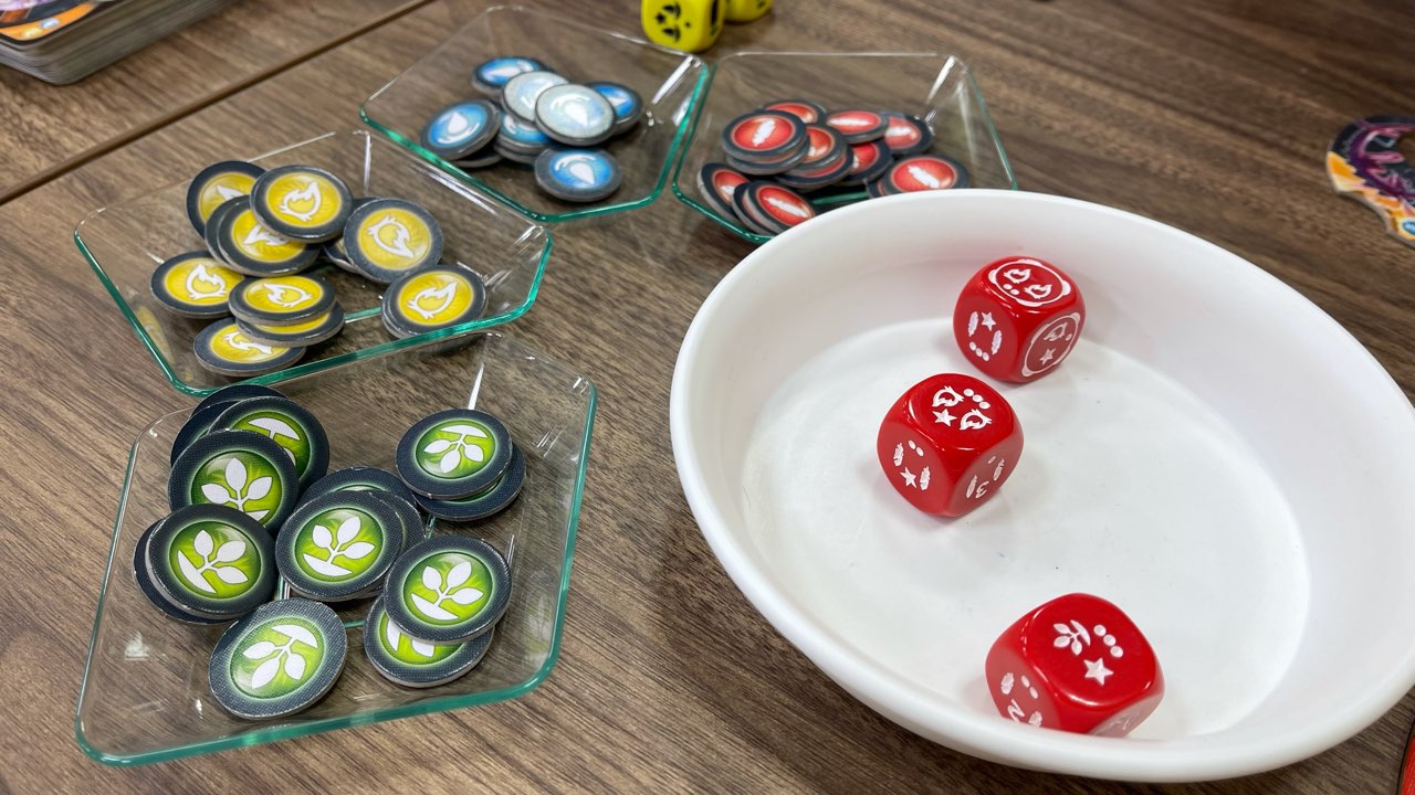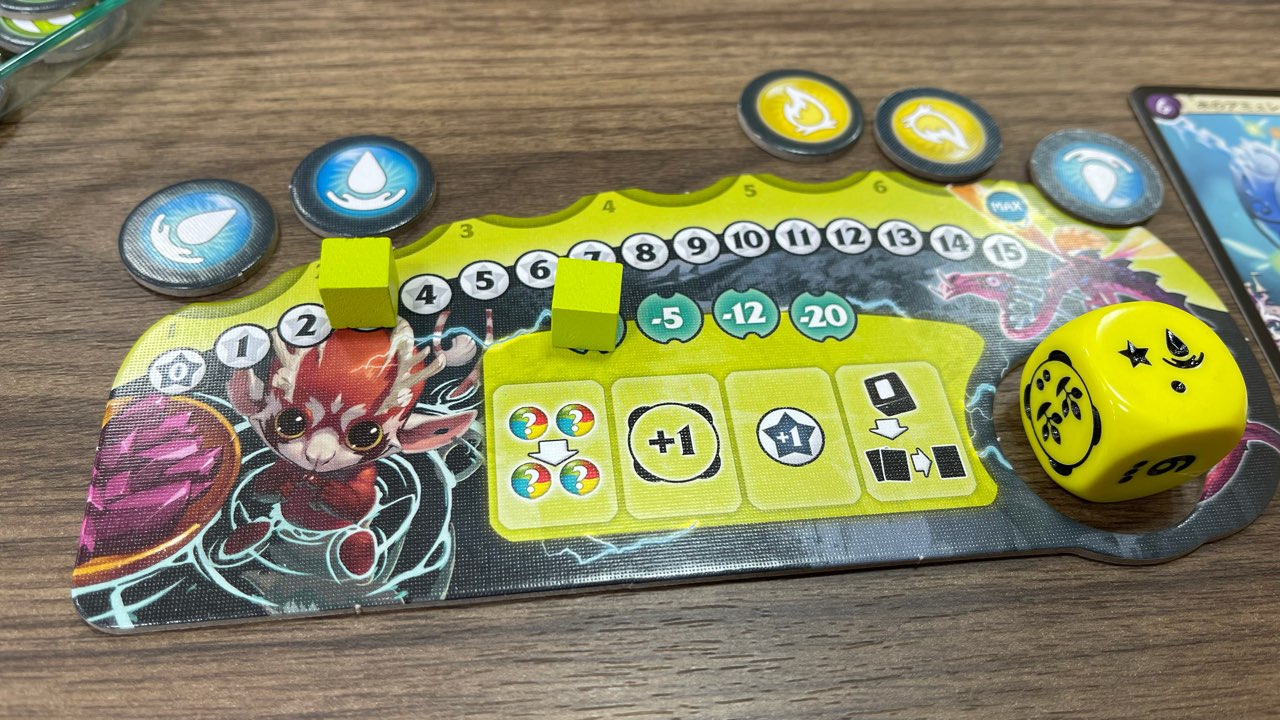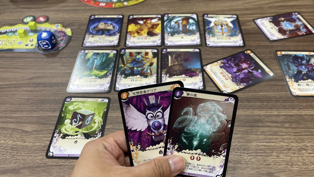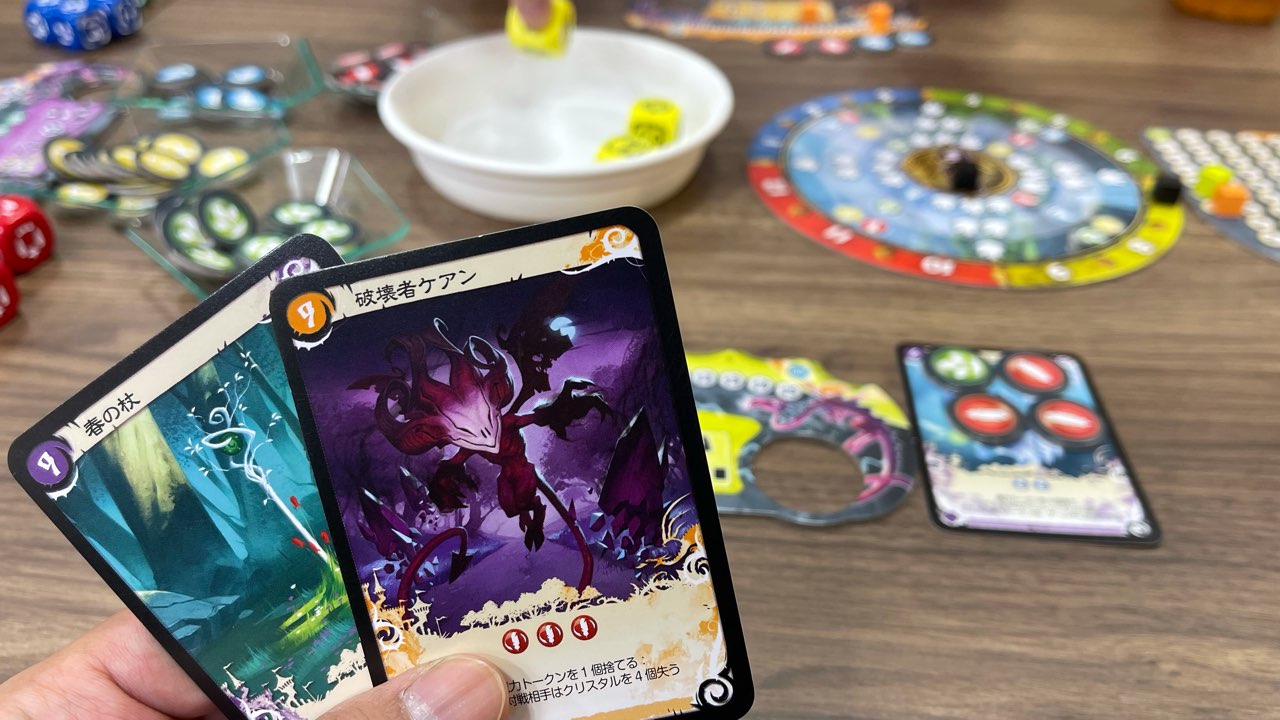プレイヤーボード上の「召喚枠」が増えていけばいくほど、場に出せるパワーカードが増えるため、振ったダイスに★マークが描かれていたら即座に確保するようにしていました。