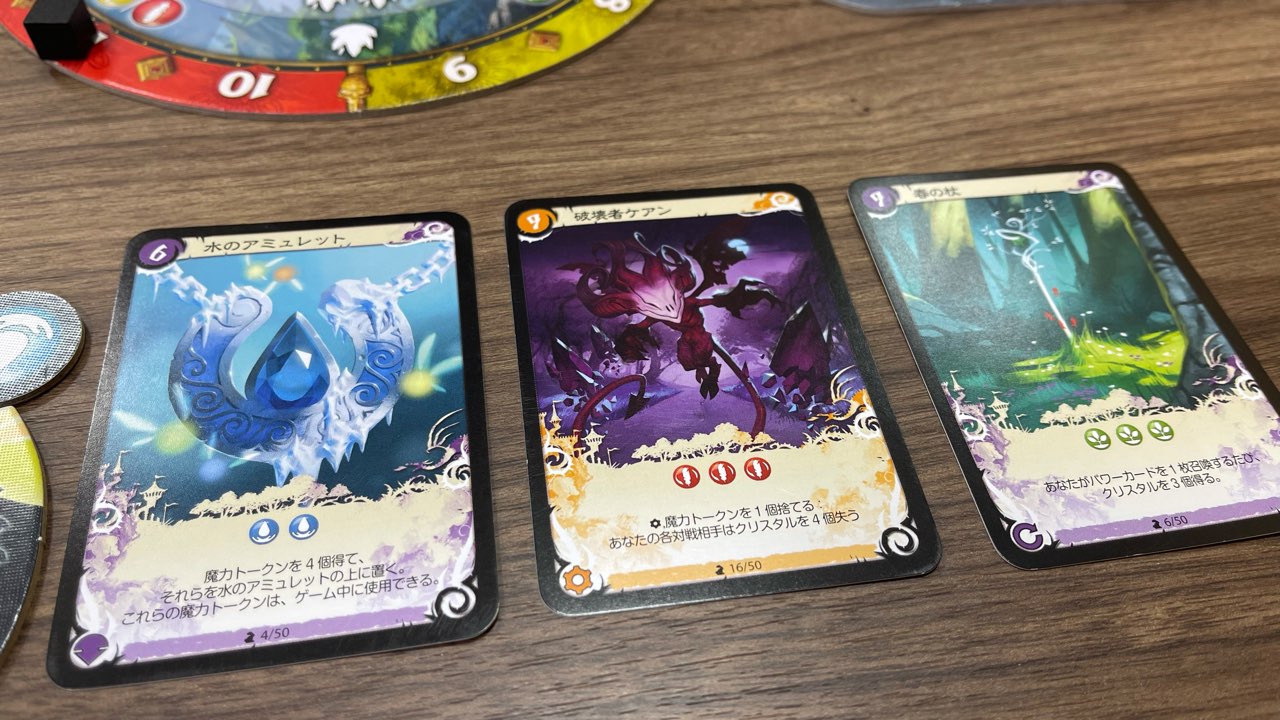 ダイスを獲得したプレイヤーは、自分の手番中に魔力トークンやクリスタルを消費して、パワーカードを発動することができます。