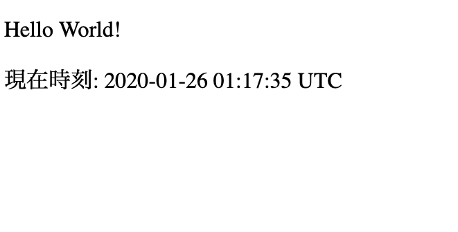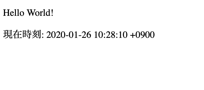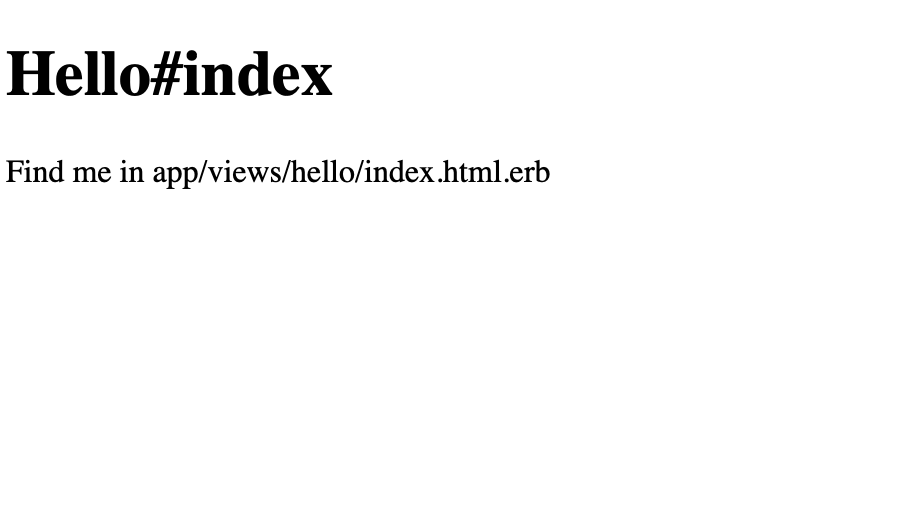 ×(削除) <h1>Hello#index</h1> ×(削除) <p>Find me in app/views/hello/index.html.erb</p> ○(追加) <p>Hello World!</p> ○(追加) <p>現在時刻: <%= Time.current %></p>