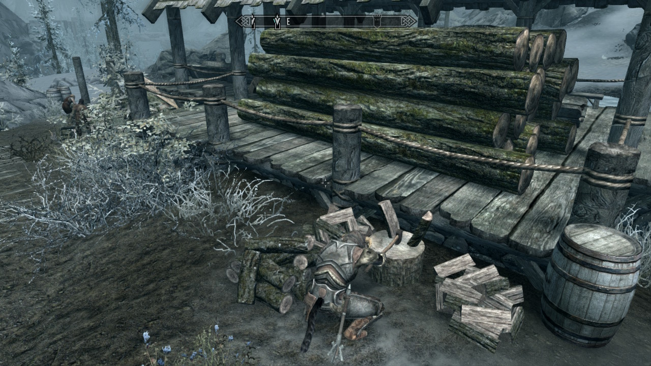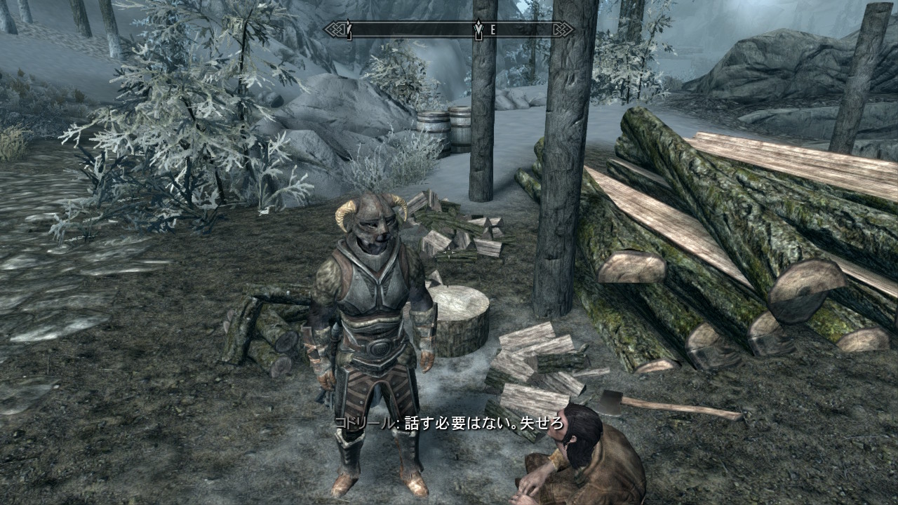 途中で見つけたバトル・ボーン農場で薪を割って金策しようとしてたら、近くにいたおっさんに「話す必要はない。失せろ」と心ない言葉を浴びせられ、いたたまれない気持ちになった僕。