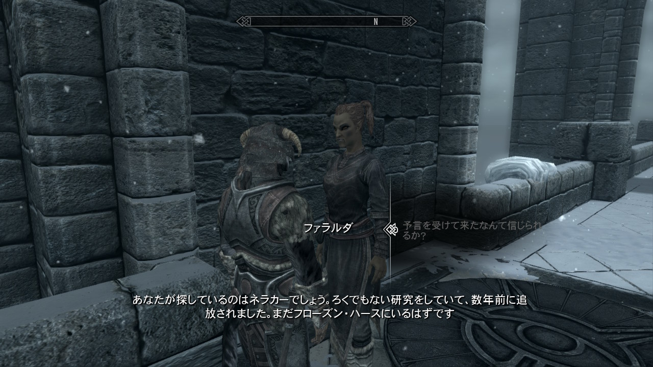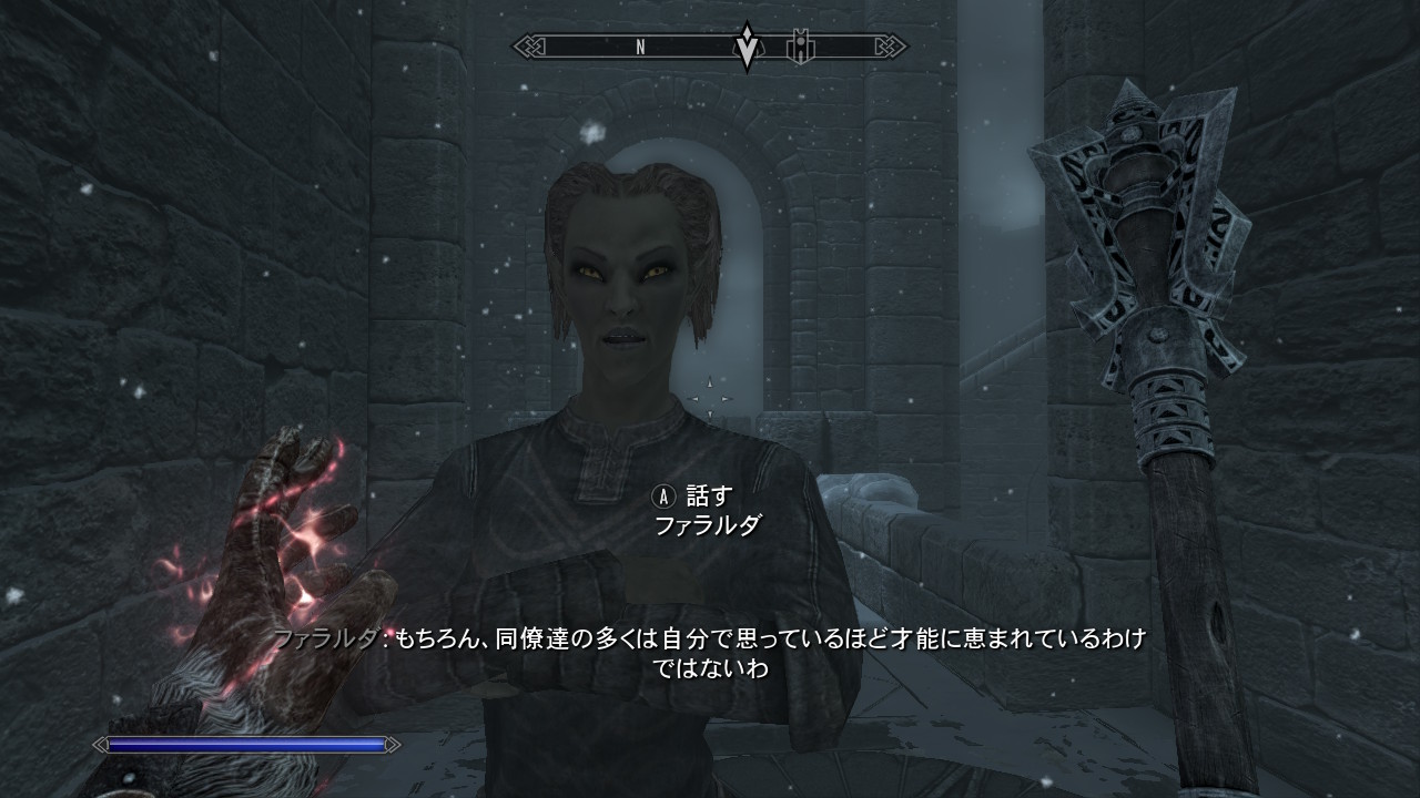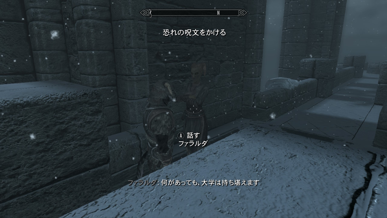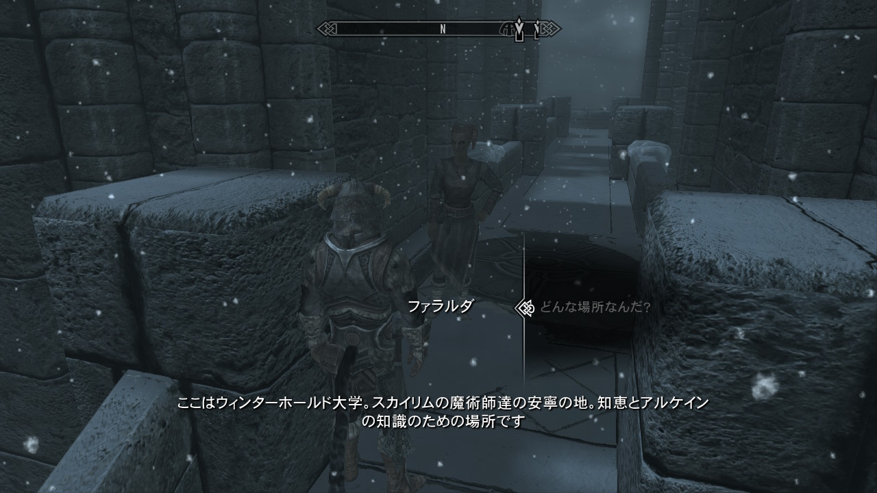 結局、ウィンターホールドの兜を取り戻して、首長に返したところで、大学入学になんの関係も無いことが判明したので、足早にウィンターホールド大学へ向かう。