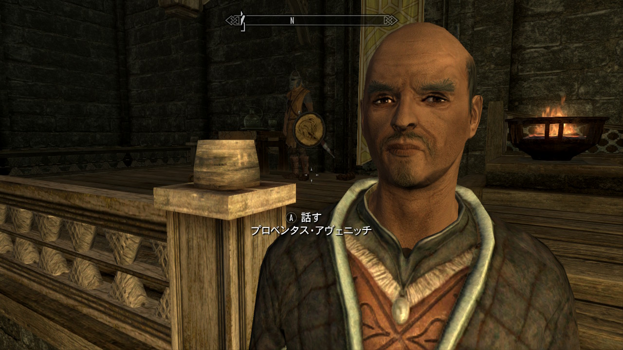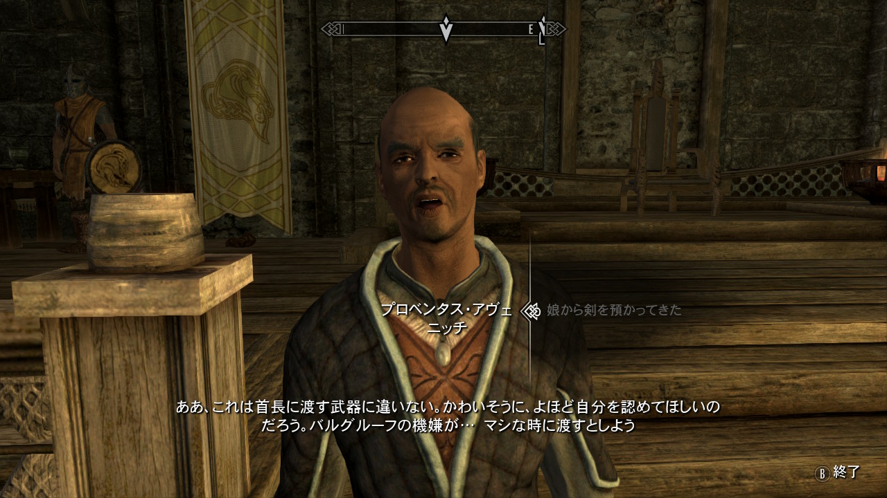 この先何をするか悩んで、一旦現在の拠点であるホワイトランに出戻り。出戻りついでにアヴェニッチ親子に挨拶。
