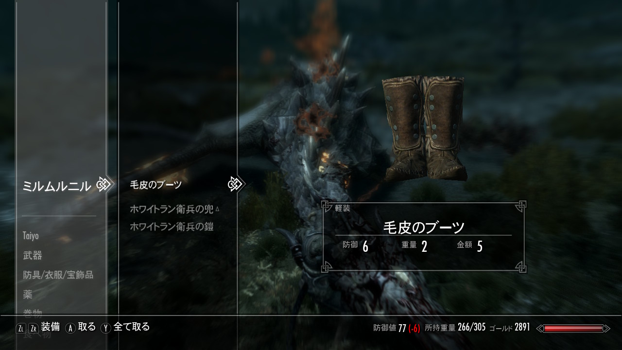忘れることなくドラゴンからアイテムを物色、、、「け、毛皮のブーツ?!(もしかしてさっき犠牲になった衛兵n、、、)」