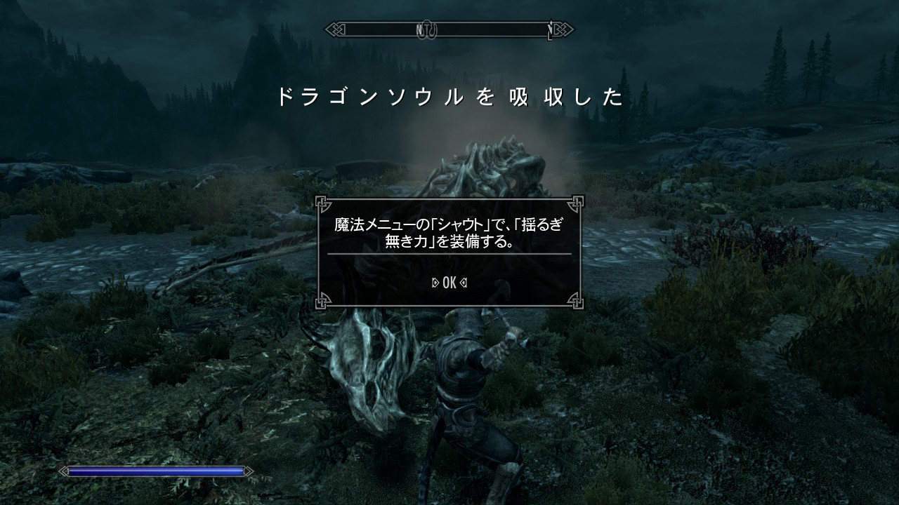 このドラゴンソウルを使って、魔法メニューのシャウトで、「揺るぎ無き力」を装備する模様。