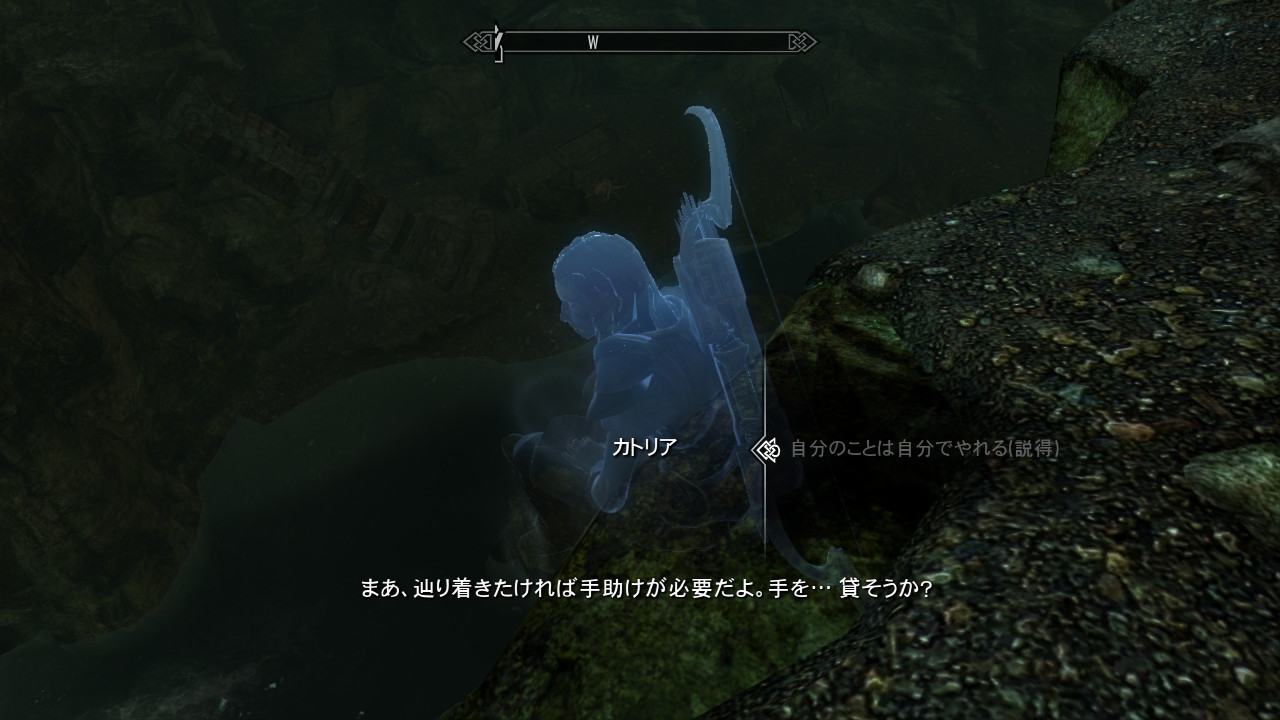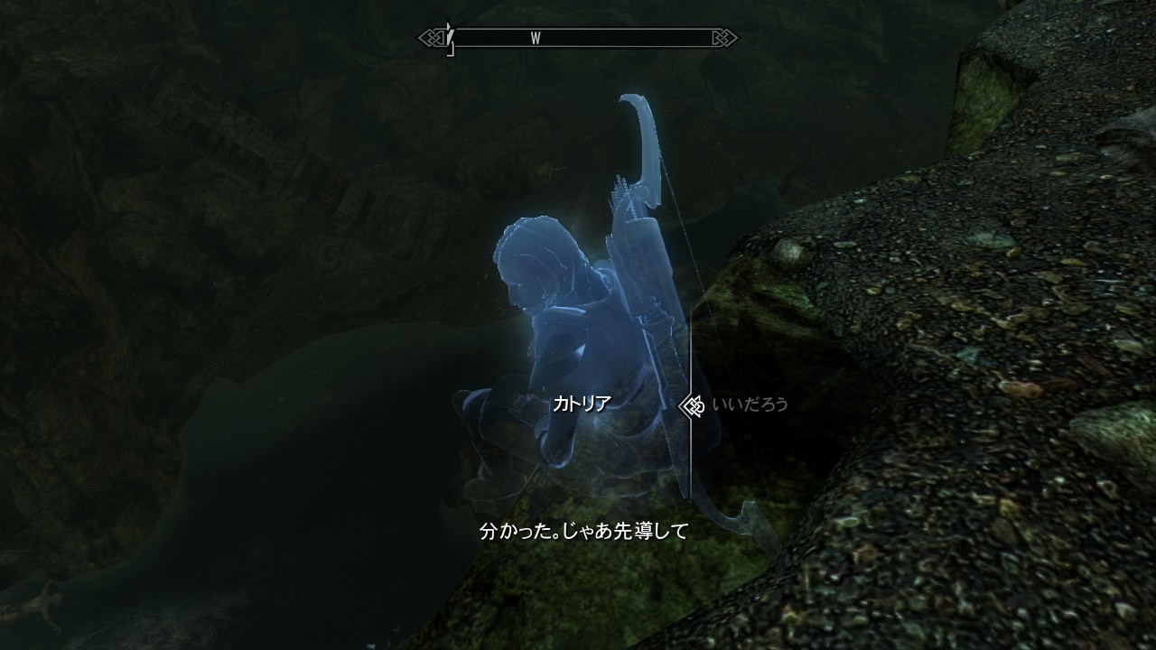 洞窟内探索に向け、付いてきてくれる雰囲気でしたが、幽霊との旅路はなんだか怖いのでやんわりと「NO」を伝える僕。そして、やんわりと「ふん、みんなそう言って結局は志半ばで倒れるのさ」と返され半強制的に付いてくるカトリアさん(アグレッシブ幽霊)。