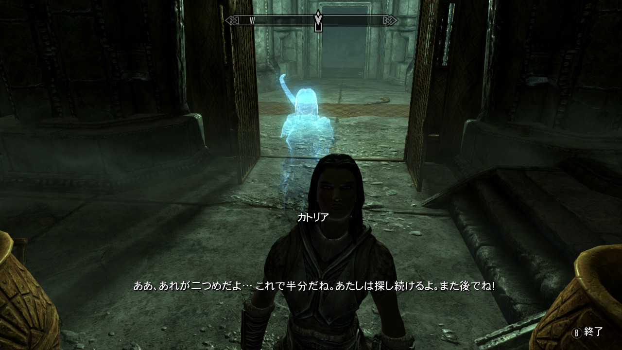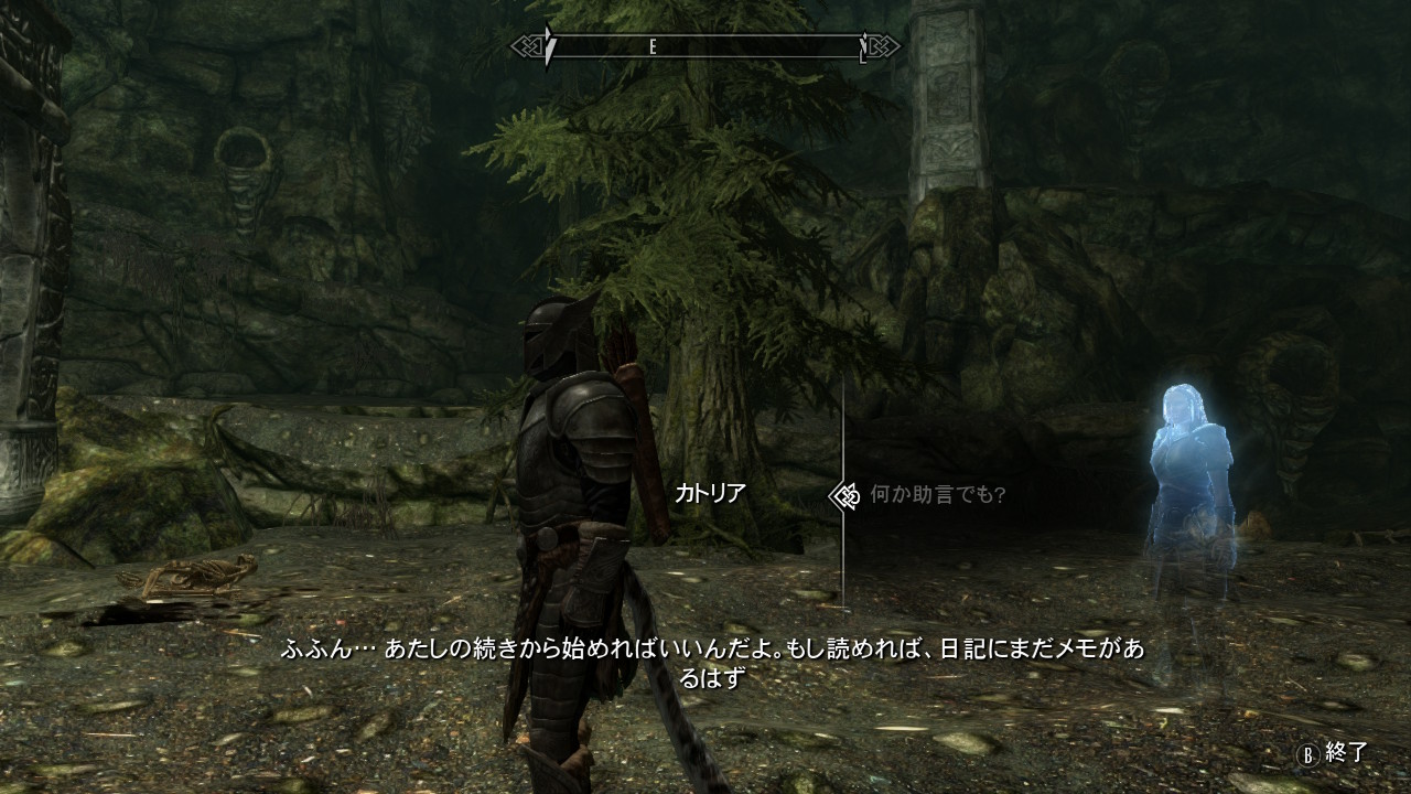 持ち物を物色すると、「カトリアの日記」を見つけたので、遺跡探索のヒントにするため懐へしまう。