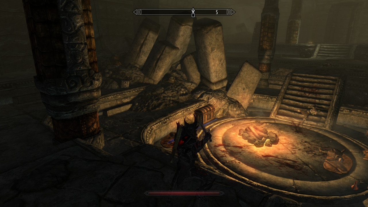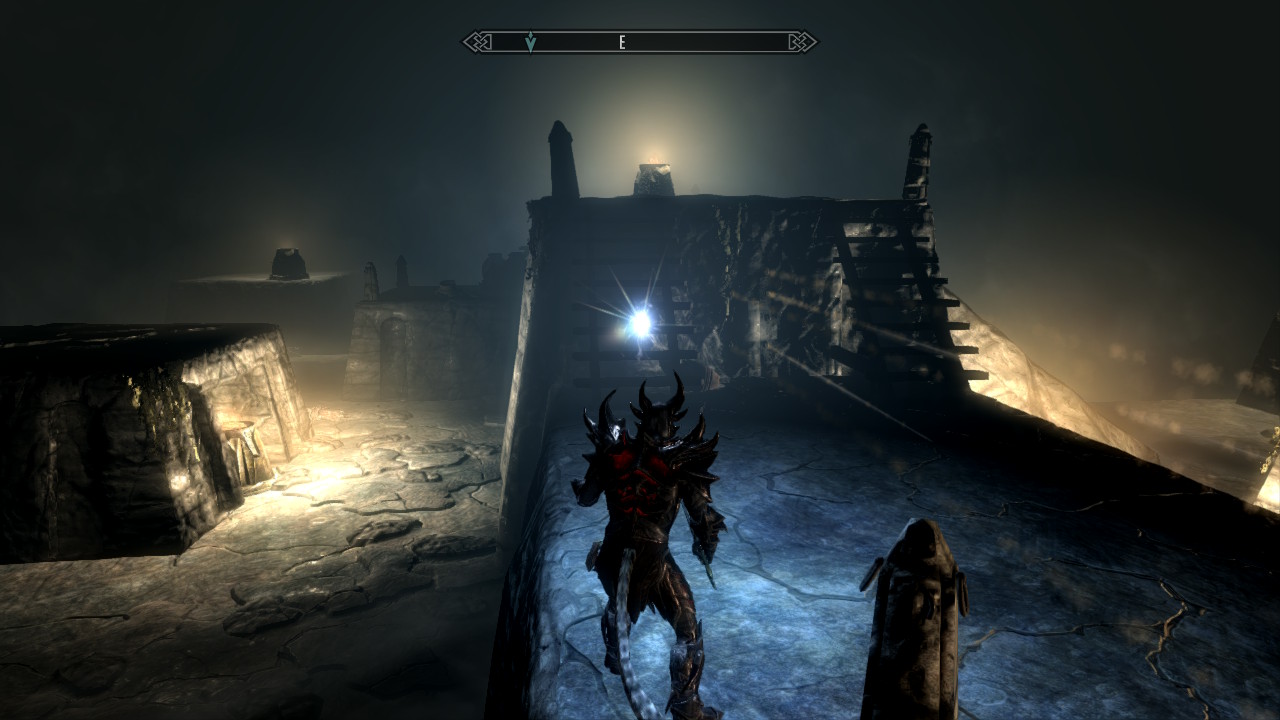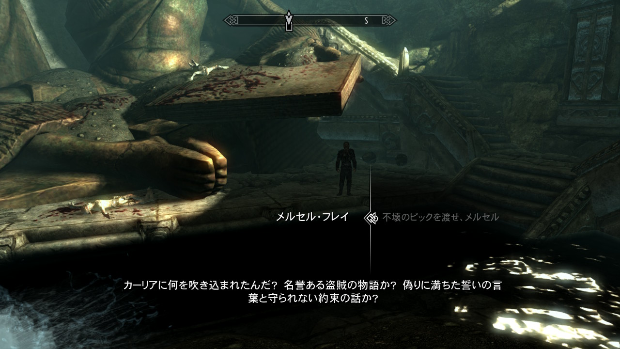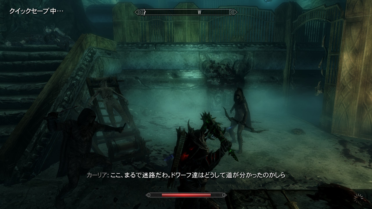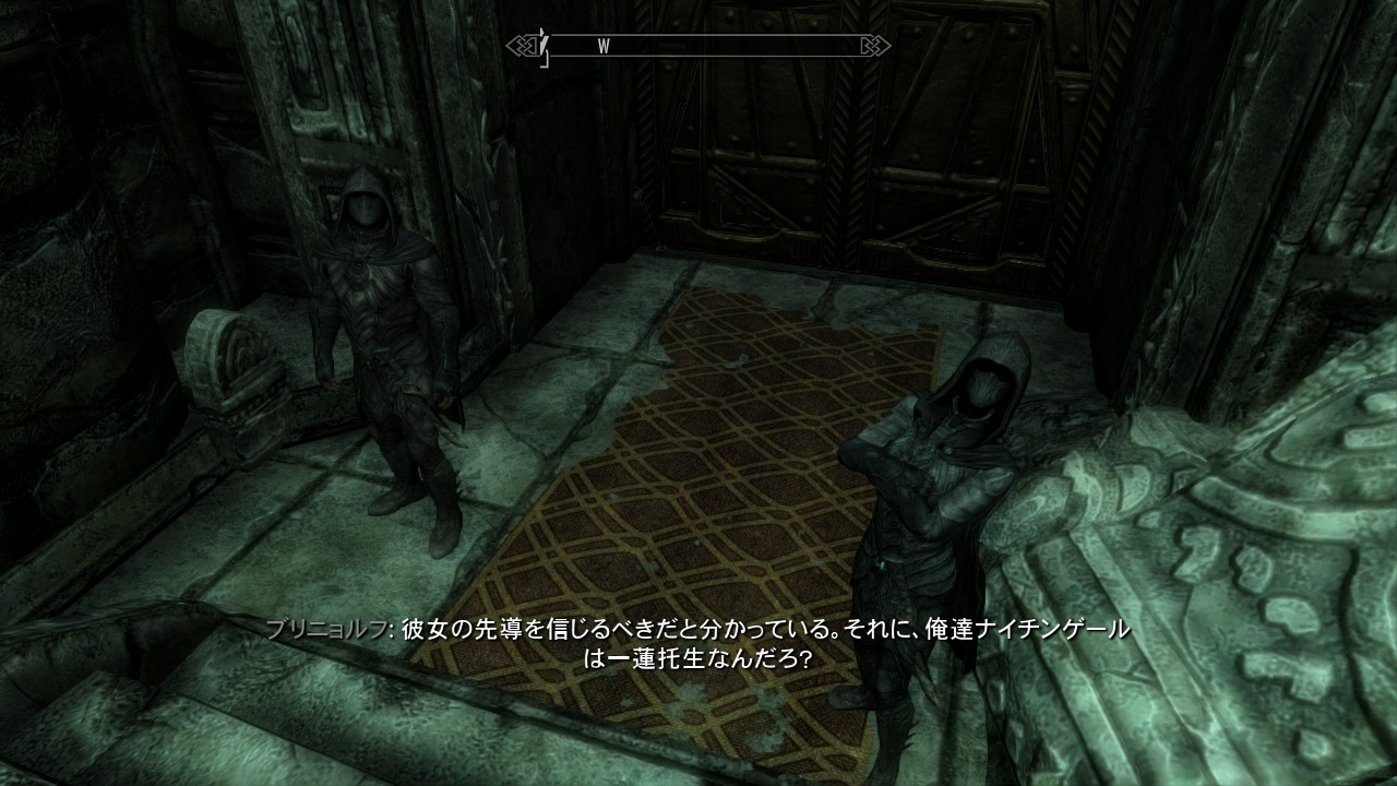 盗賊ギルドクエスト「ブラインドサイド」にて、新たなナイチンゲールとなったブリニョルフ、カーリア、僕はメルセル・フレイを追ってドゥーマー遺跡イルクンサンドへ潜入開始。