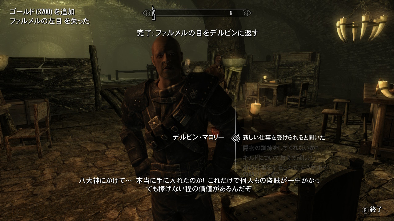 ちなみに、ファルメルの左目を盗賊ギルドにいるデルビン・マロリーに渡すと3200ゴールドもらえた。デルビン曰く、「何人もの盗賊が一生かかっても稼げないほどの価値があるんだぞ」とのことですが、3200ゴールド程度ならバニッシュ符呪ダガー3本売ったらお釣りがくることを伝えるか迷った僕。