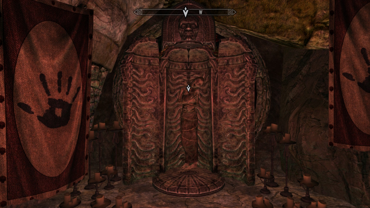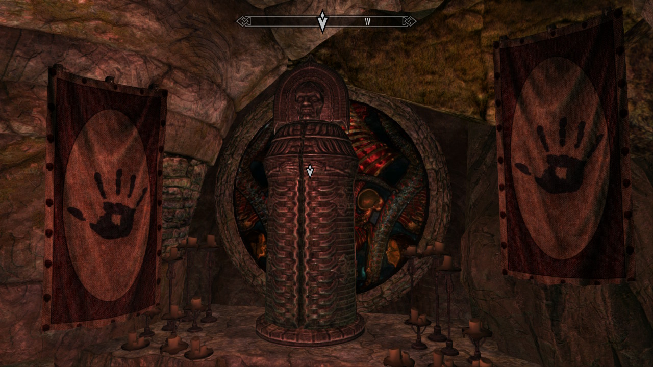 闇の一党アジト内部には禍々しいオブジェや手のマークが刻印された旗が飾られています。