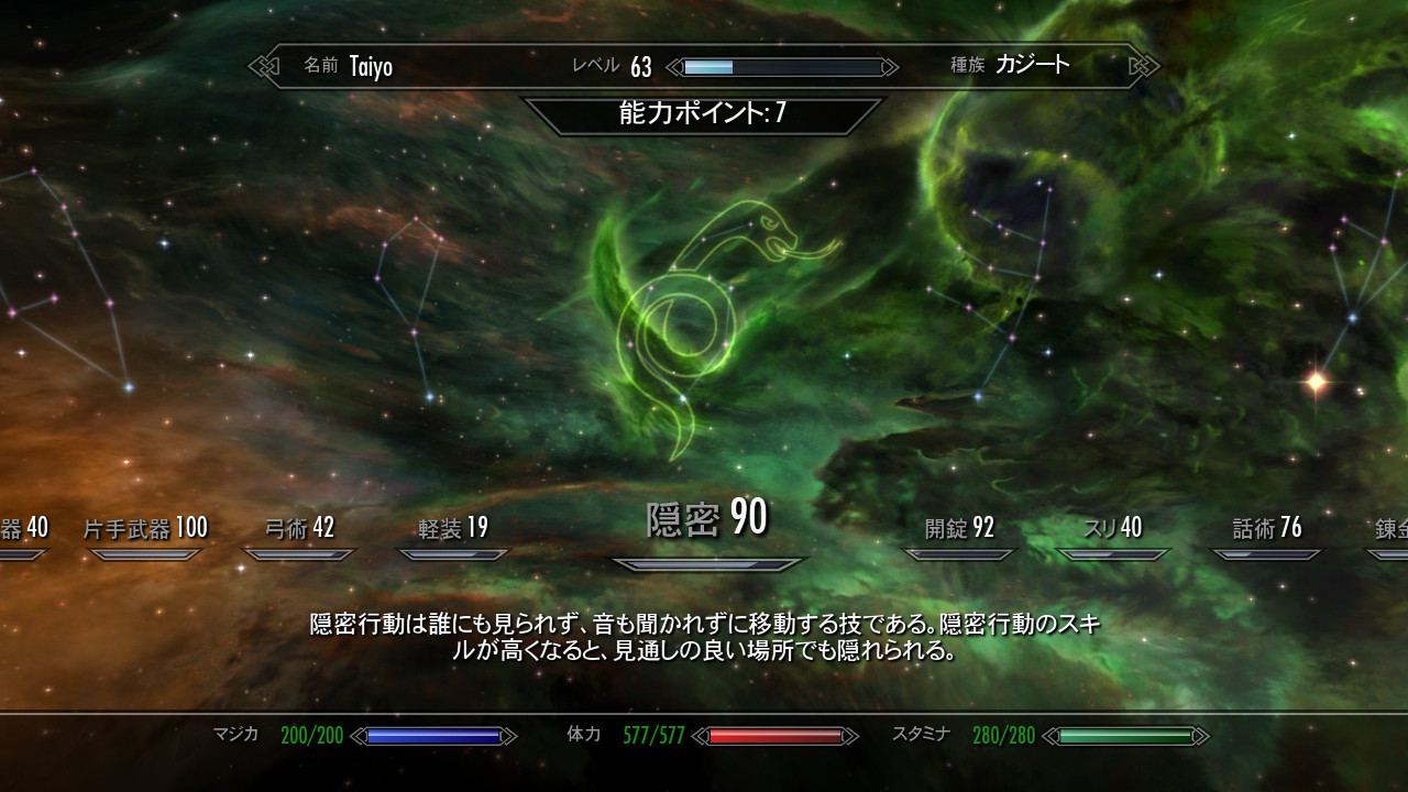 あまりにも闇の一党稼業が難しすぎるので、一旦隠密パークを上げ、服装もデイドラ装備から闇の一党装備に変更。