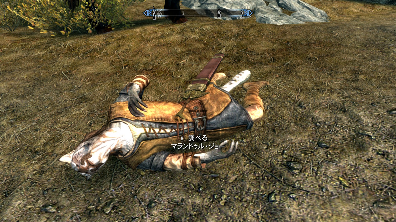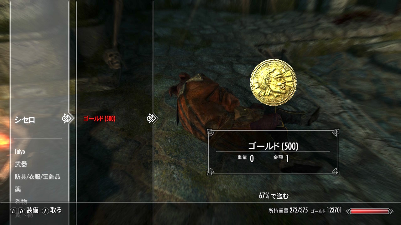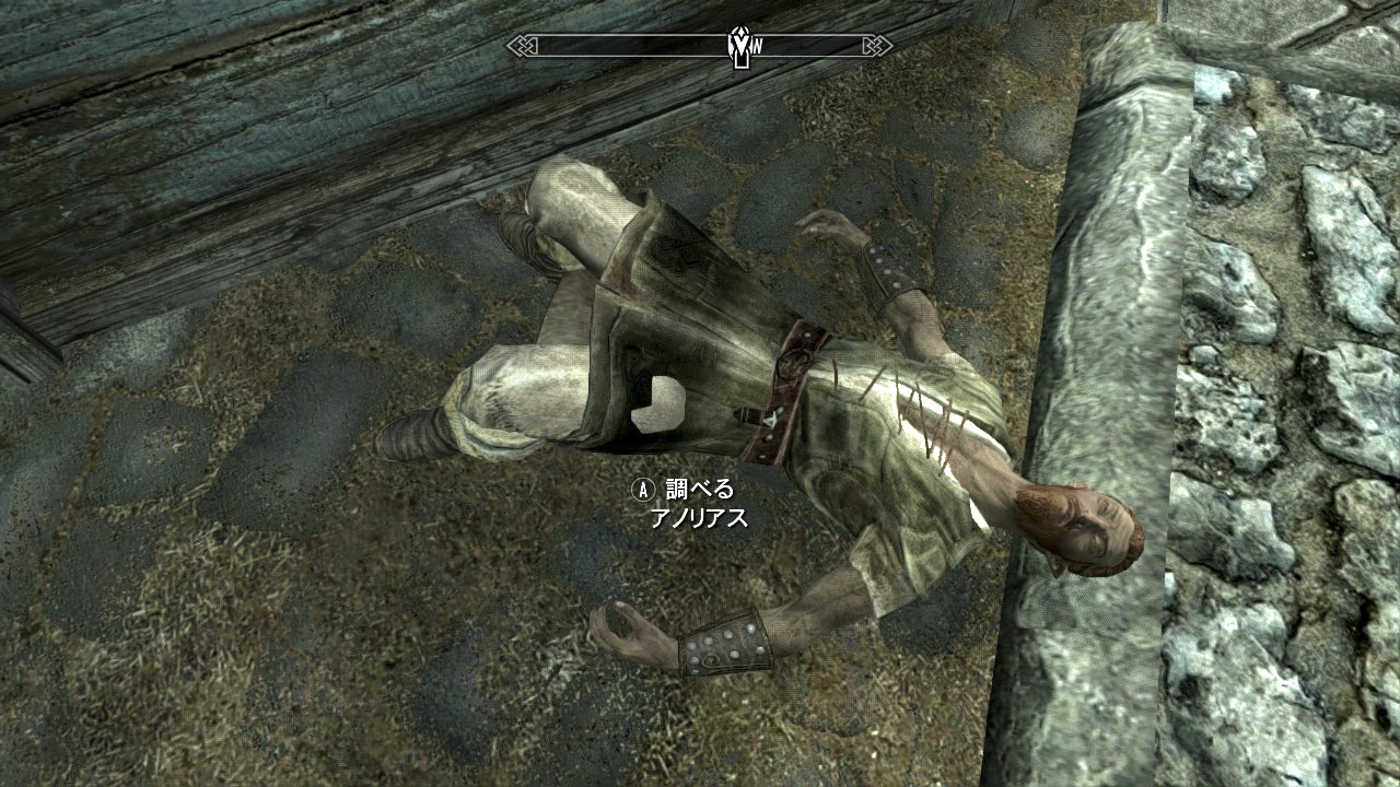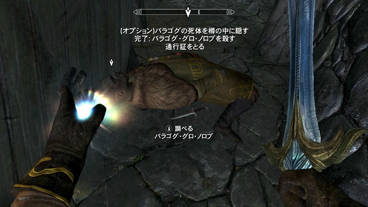 前回シセロをボコボコにして見逃すことに決めたドヴァキンですが、せっかくなのでやつの持ち物をスってやろうとポケットをガサゴソ漁ると、、、