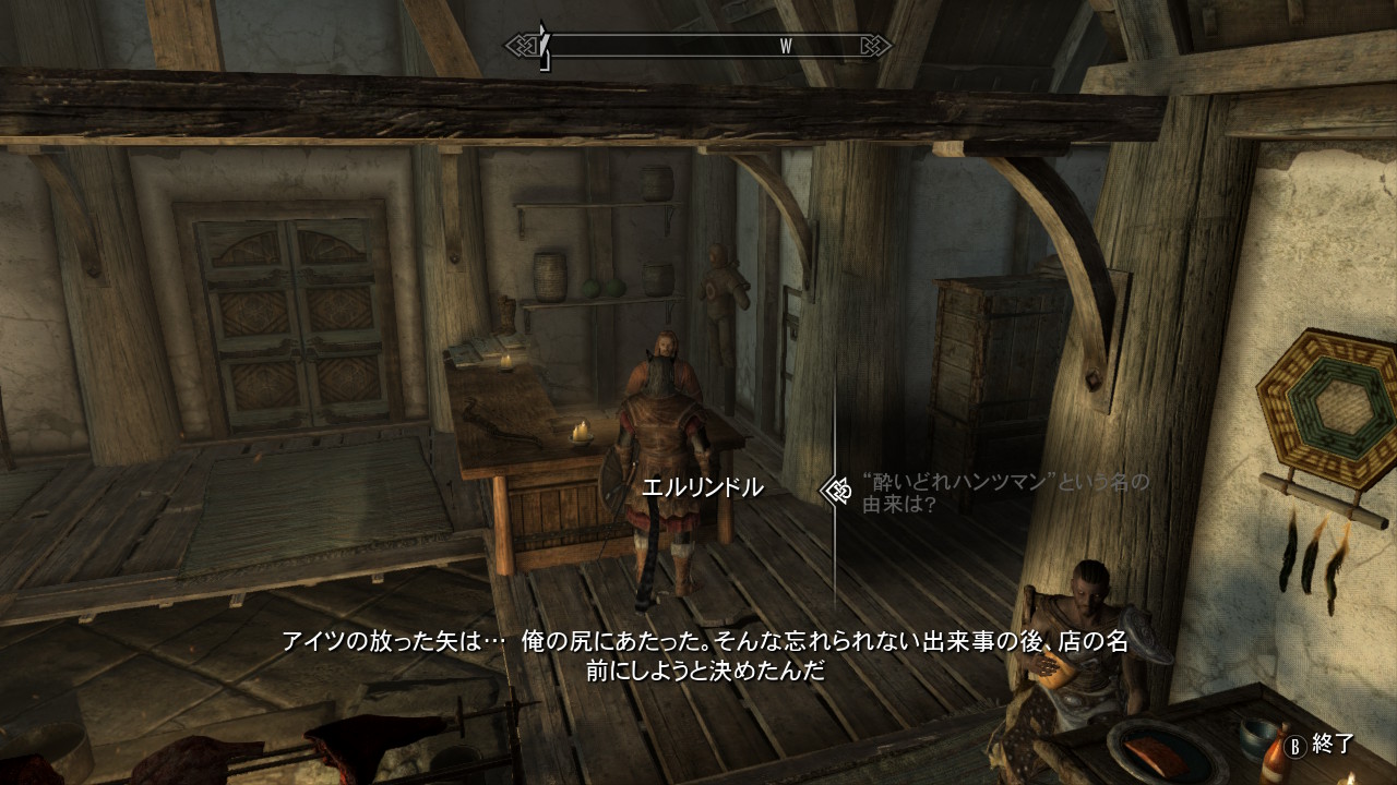 【上画像】「酔いどれハンツマン」の由来を聞きたかっただけなのに、何度か卓上の物を盗んで衛兵に追いかけられて再ロードした