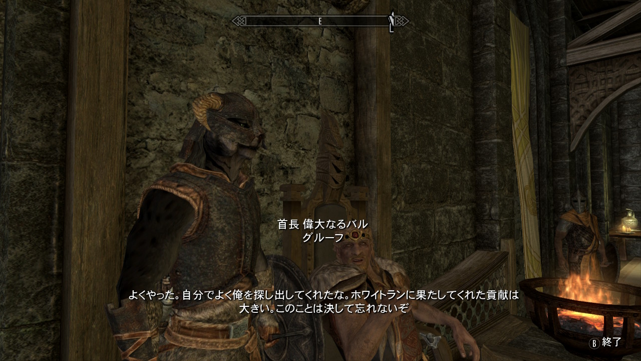 【上画像】ホワイトランの首長偉大なるバルグルーフに横から声をかけたら、御付きの人みたいな立ち位置になったカジートの僕