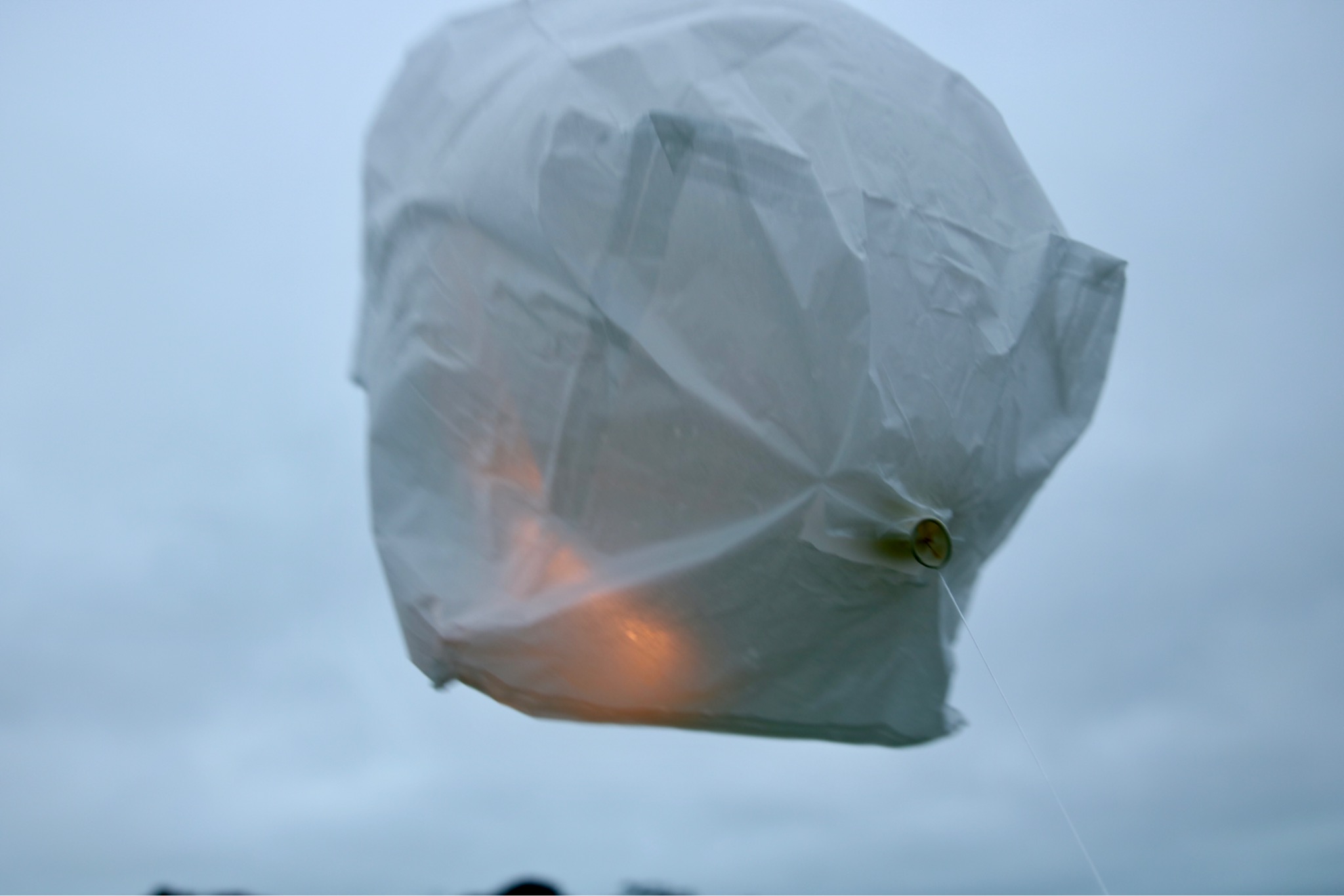 現地は風が強く、数名のスカイランタンが既に空高く飛ぶ姿や、芝生に突き刺さって割れる音が聞こえてきます。