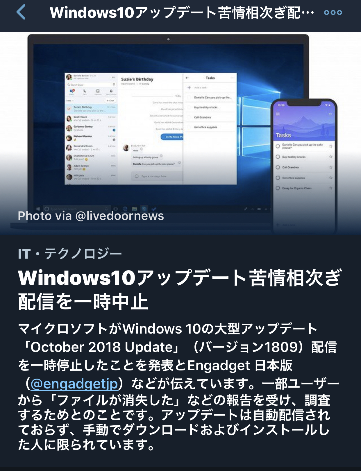 そんな中、Windows10のOctober2018 updateが配信されるや否や、ファイルが消失したり、起動すらできなくなったりするエラーが多発しているようです。