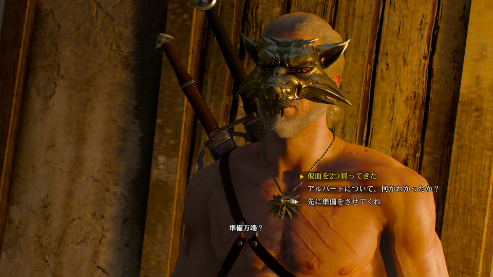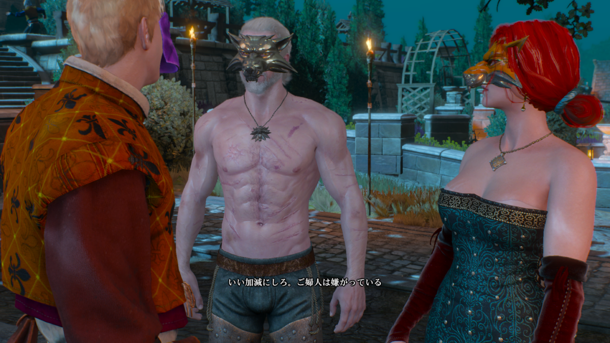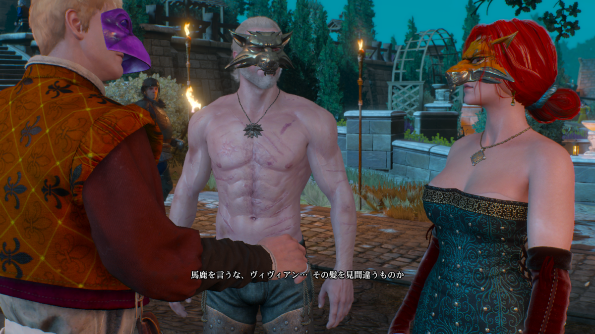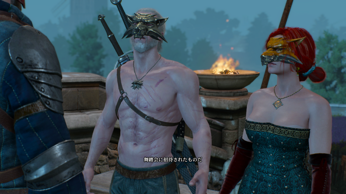 仮面舞踏会参加の前に、トリスに「ちゃんと正装してきてね」と言われたので、ウィッチャー 流の正装(上裸肉体美)にてパーティ会場へ。