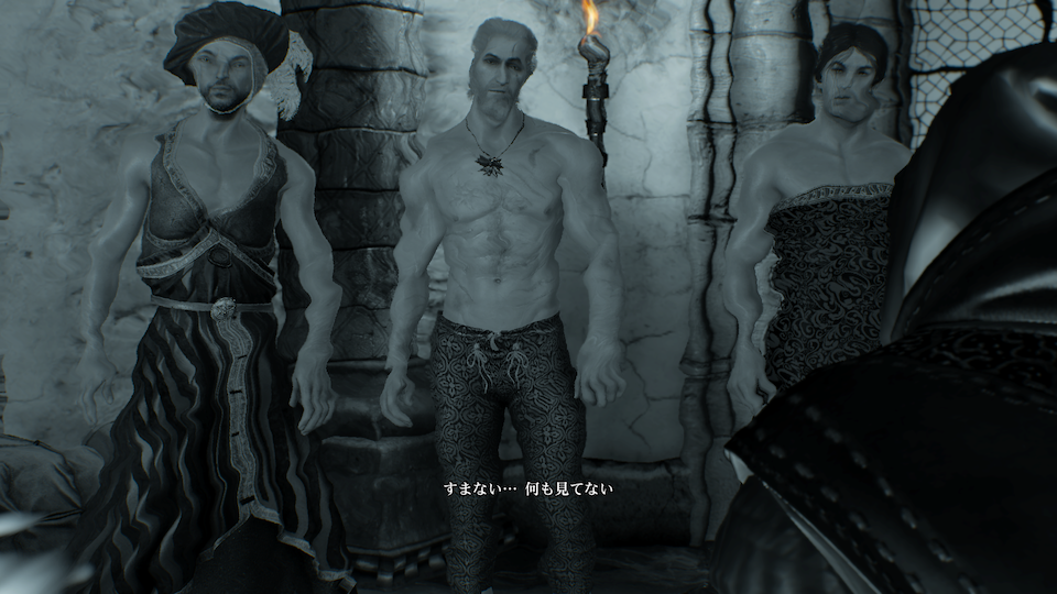 故郷であるケィア・モルヘンにて、旧友のウィッチャー たち(ランバートとエスケル)と夜更けまで酒を飲み交わした結果、「女が足りねぇ!」という話になった際の結末がこれ。
