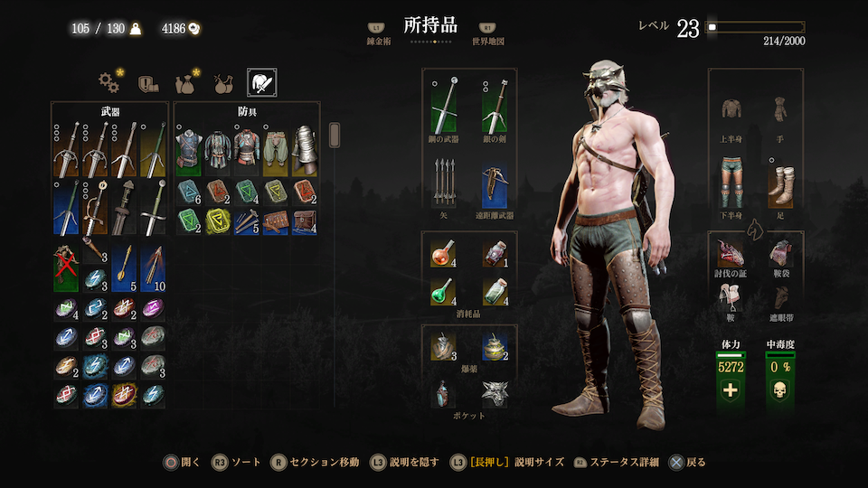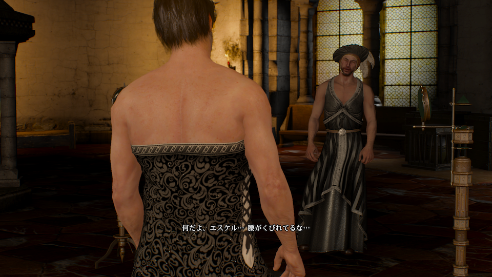 正装用の服を試した結果、貴族っぽい服が似合わなかったので、「ウィッチャー といえば筋肉!よし、いっそ上着なんて脱いでしまえ!!」ということで服装が決まり。