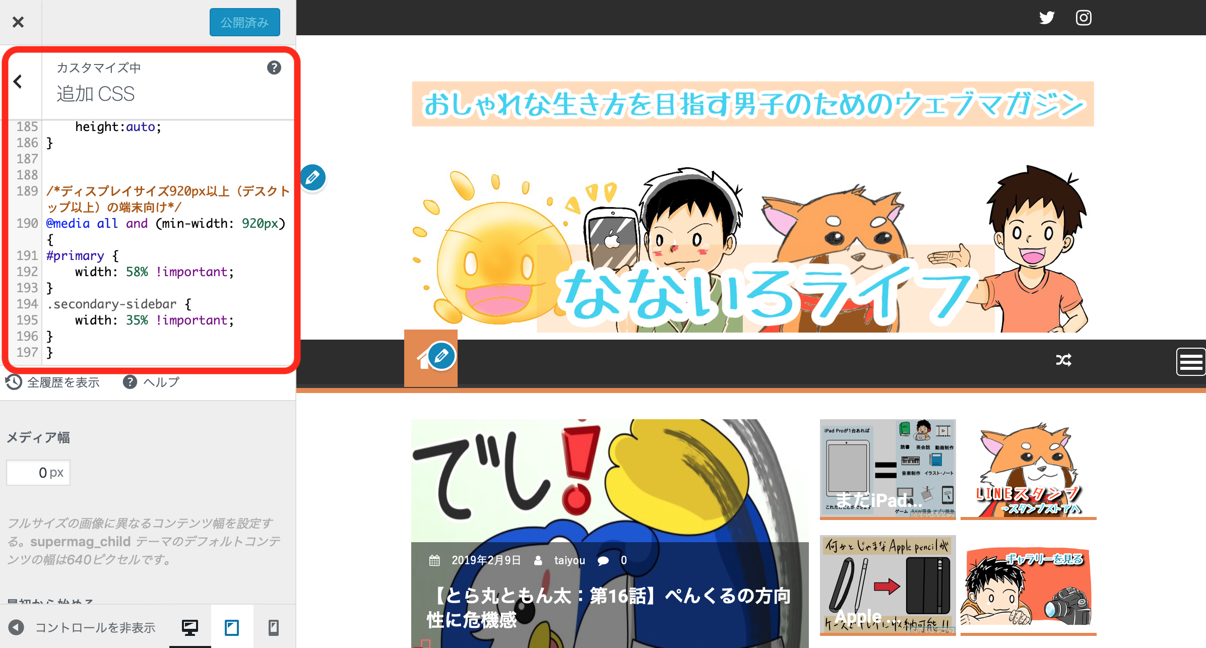 WordPressダッシュボード>SuperMag>外観>カスタマイズ>追加CSS