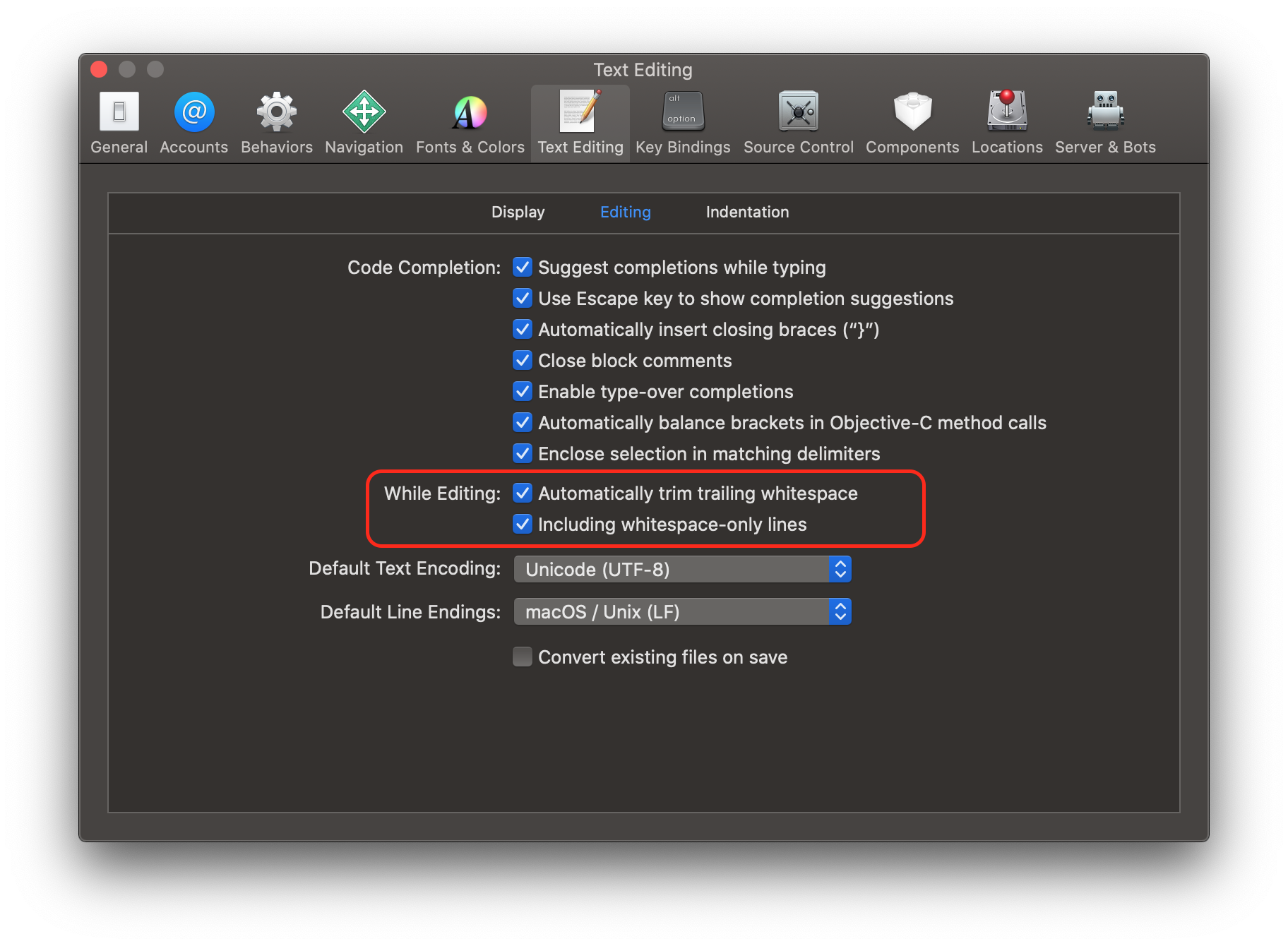 Xcode→Preferences→text editing→Editing内