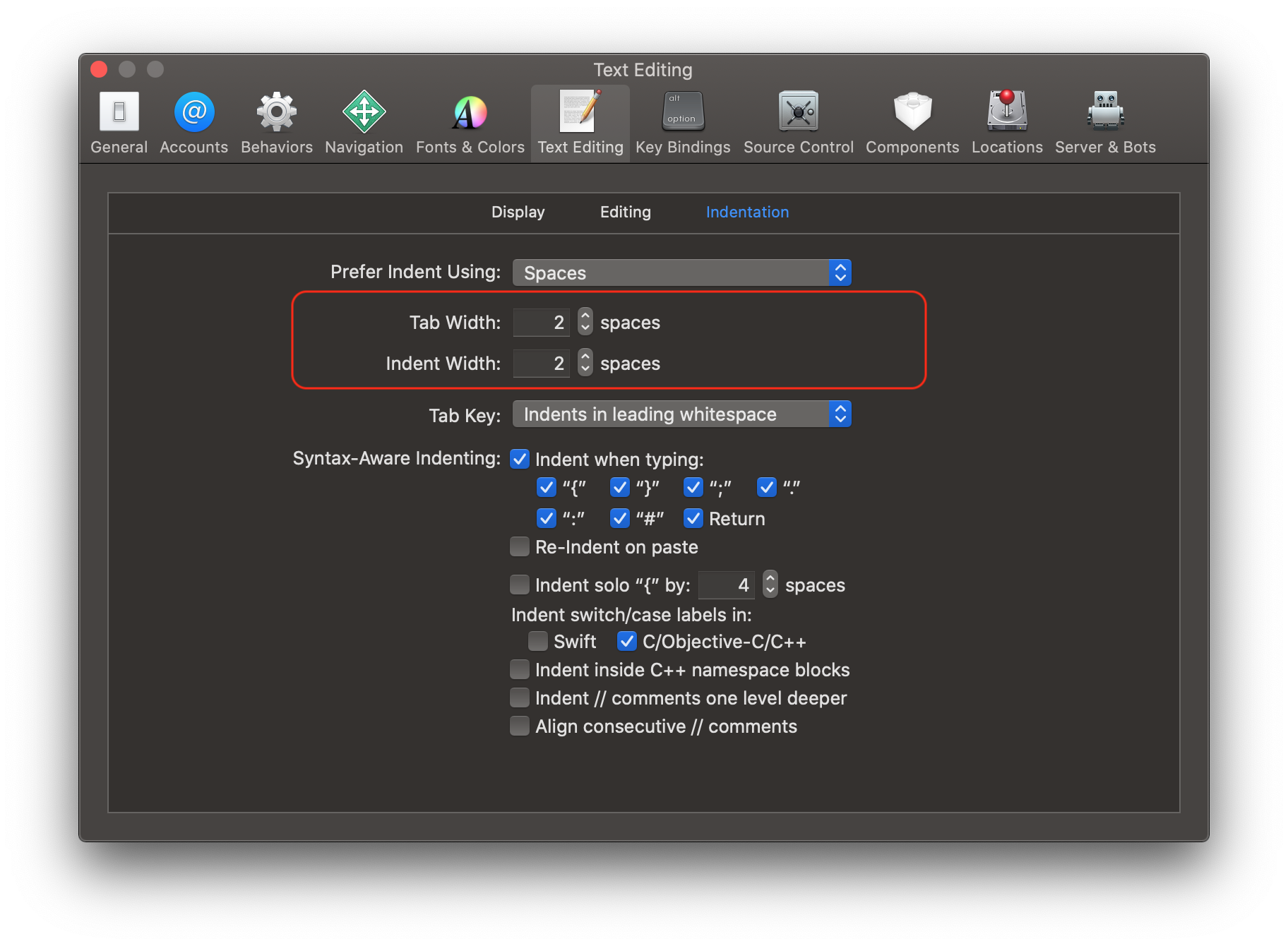 Xcode→Preferences→text editing→Indentation内